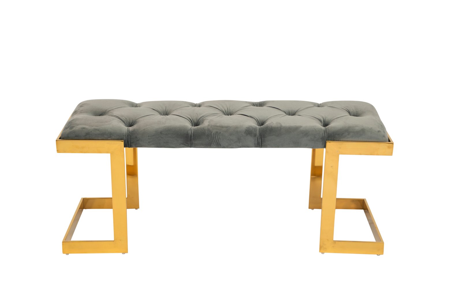 This bench features a plush velvet fabric upholstered and button-tufted seat supported with two polished stainless steel base frames creating a sturdy and elegant design.