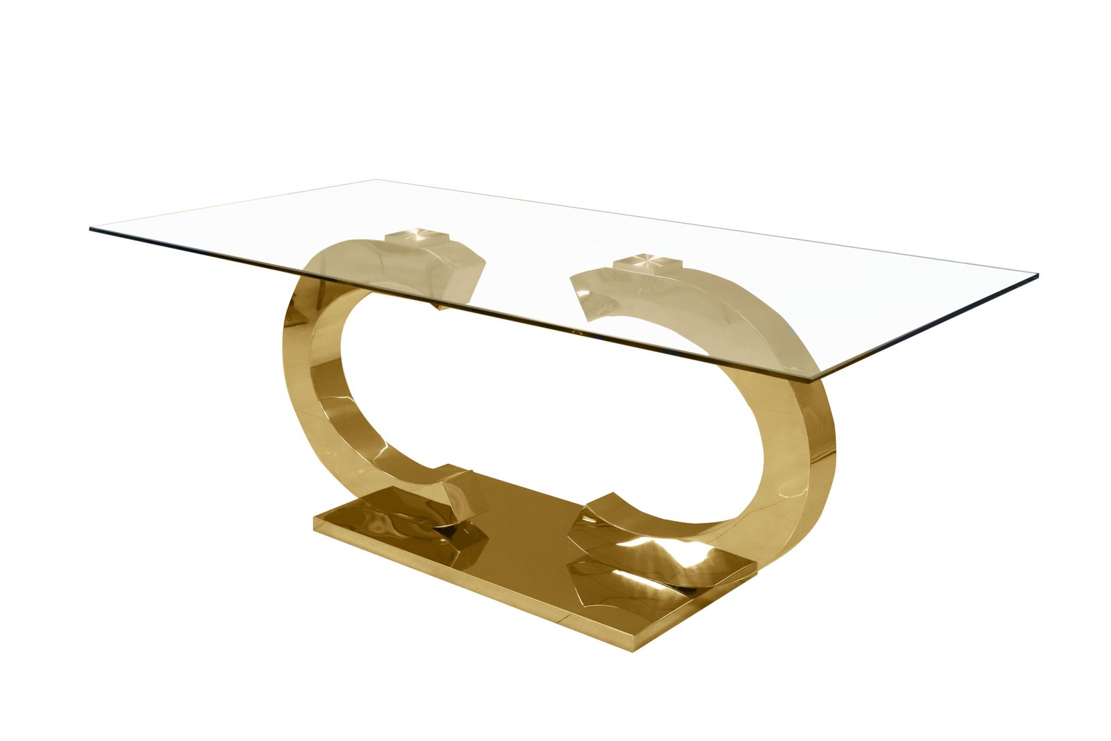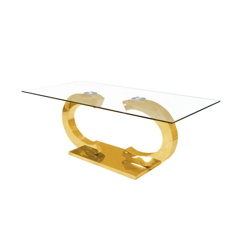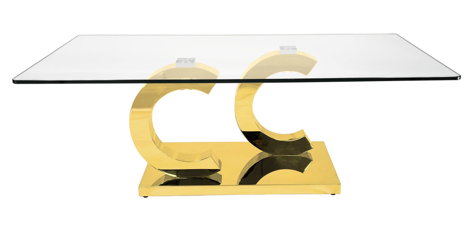 This coffee table features a 12mm thick tempered clear glass top with two polished gold stainless-steel C-shaped pedestals and a matching rectangular stainless-steel platform base.