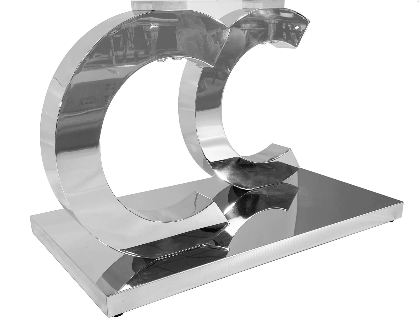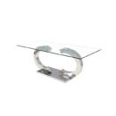 This coffee table features a 12mm thick tempered clear glass top with two polished silver stainless-steel C-shaped pedestals and a matching rectangular stainless-steel platform base.