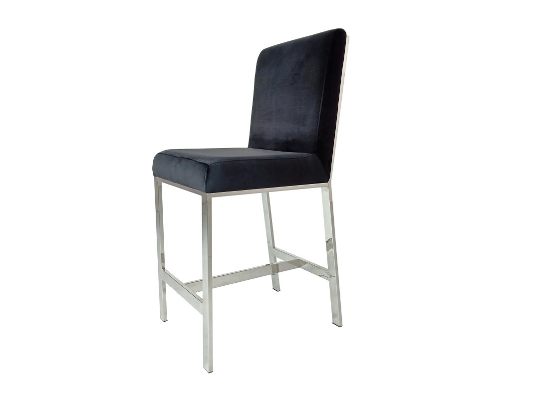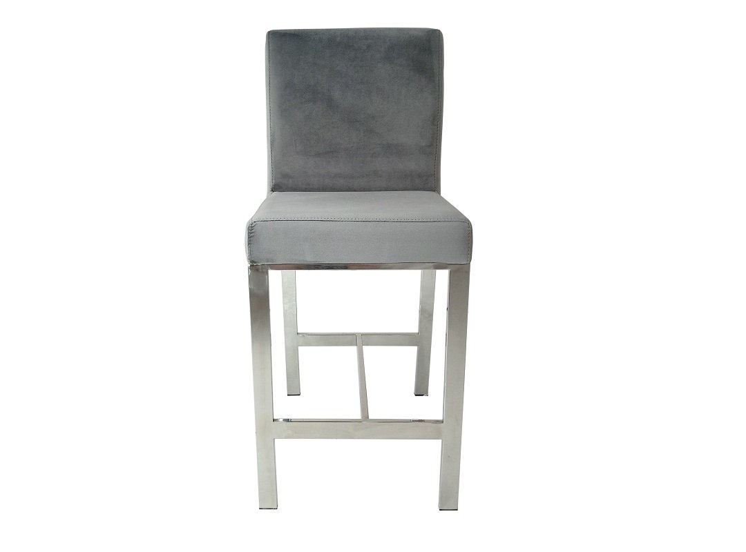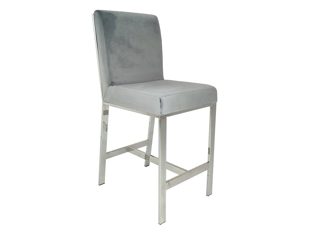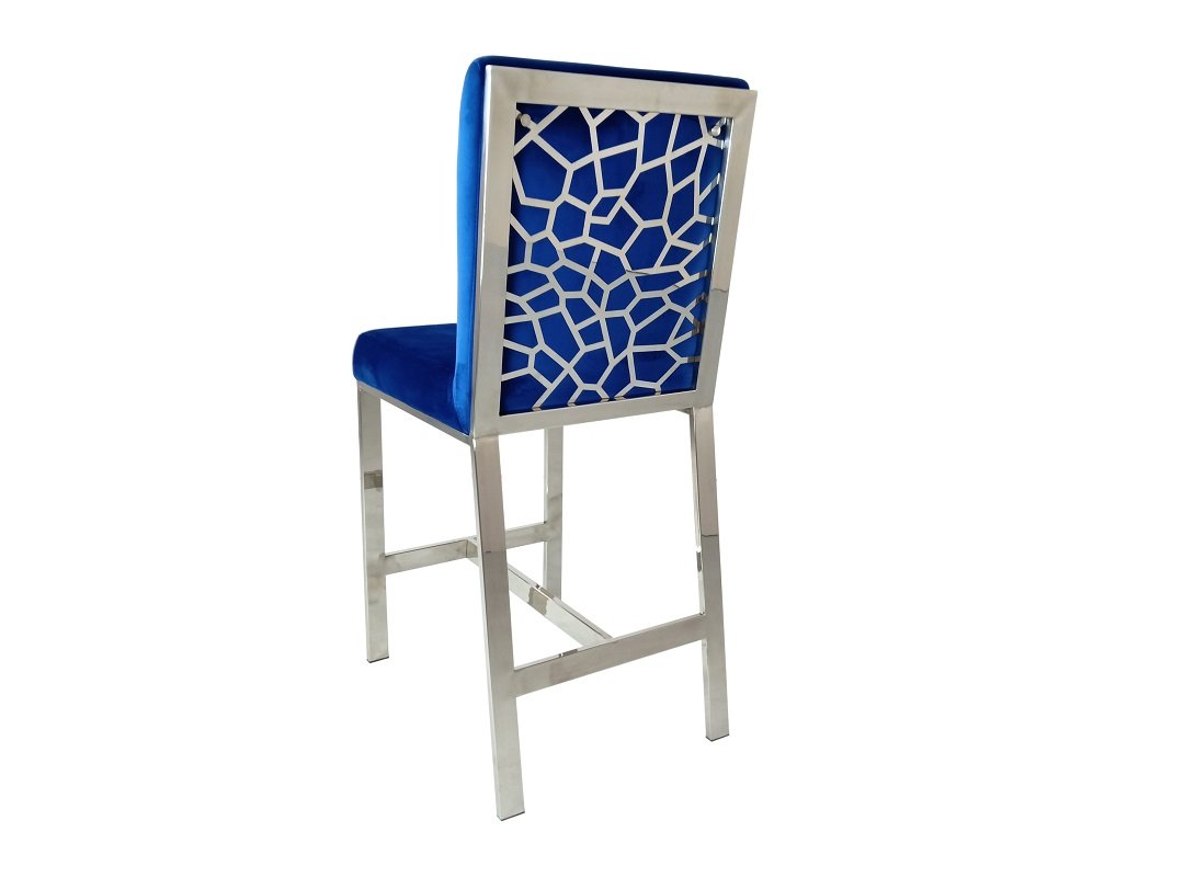 This counter-height chair features a plush velvet fabric upholstered seat with polished silver stainless steel laser-cut back in a unique shattered abstract pattern. The base of the chair is crafted in matching silver stainless-steel with four vertical straight legs.