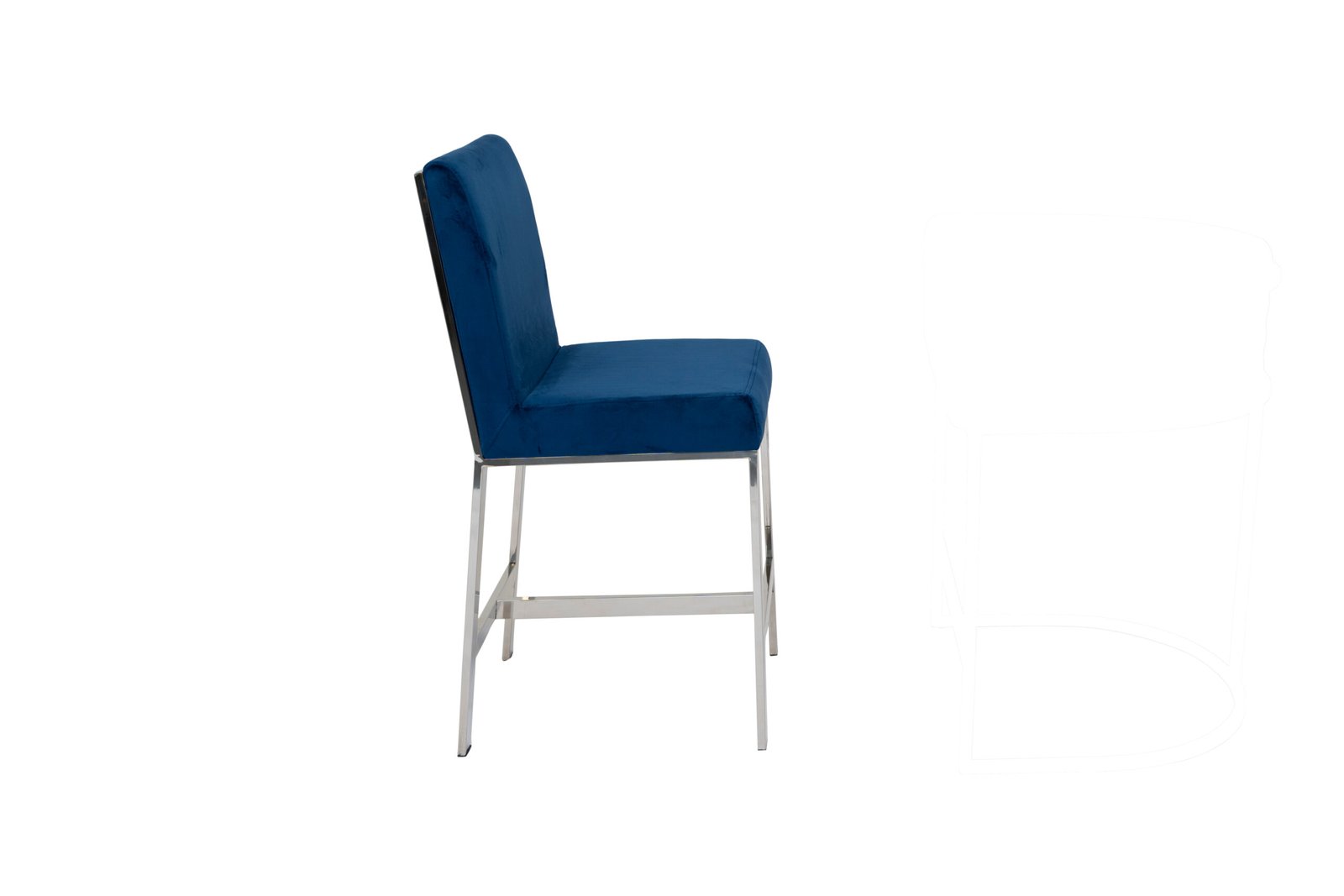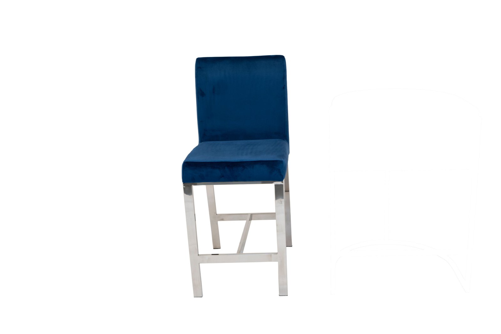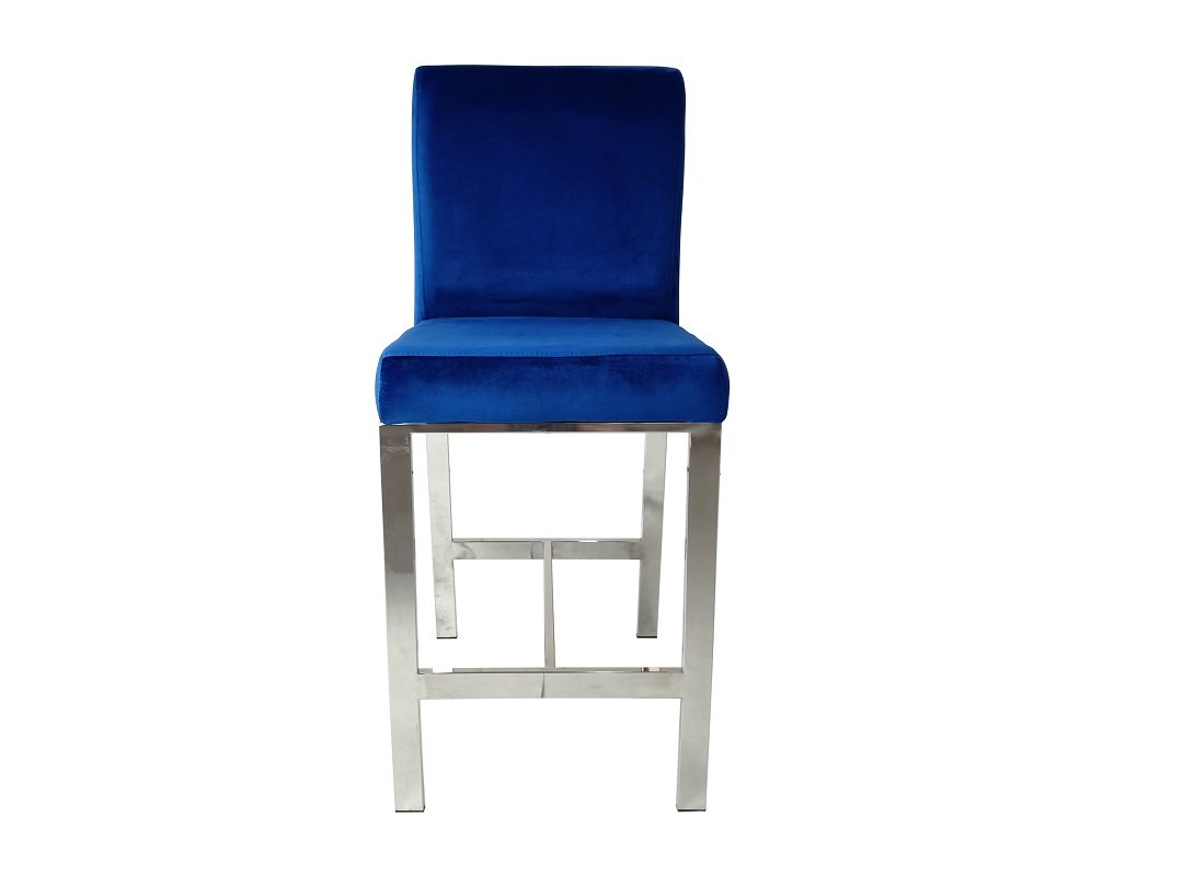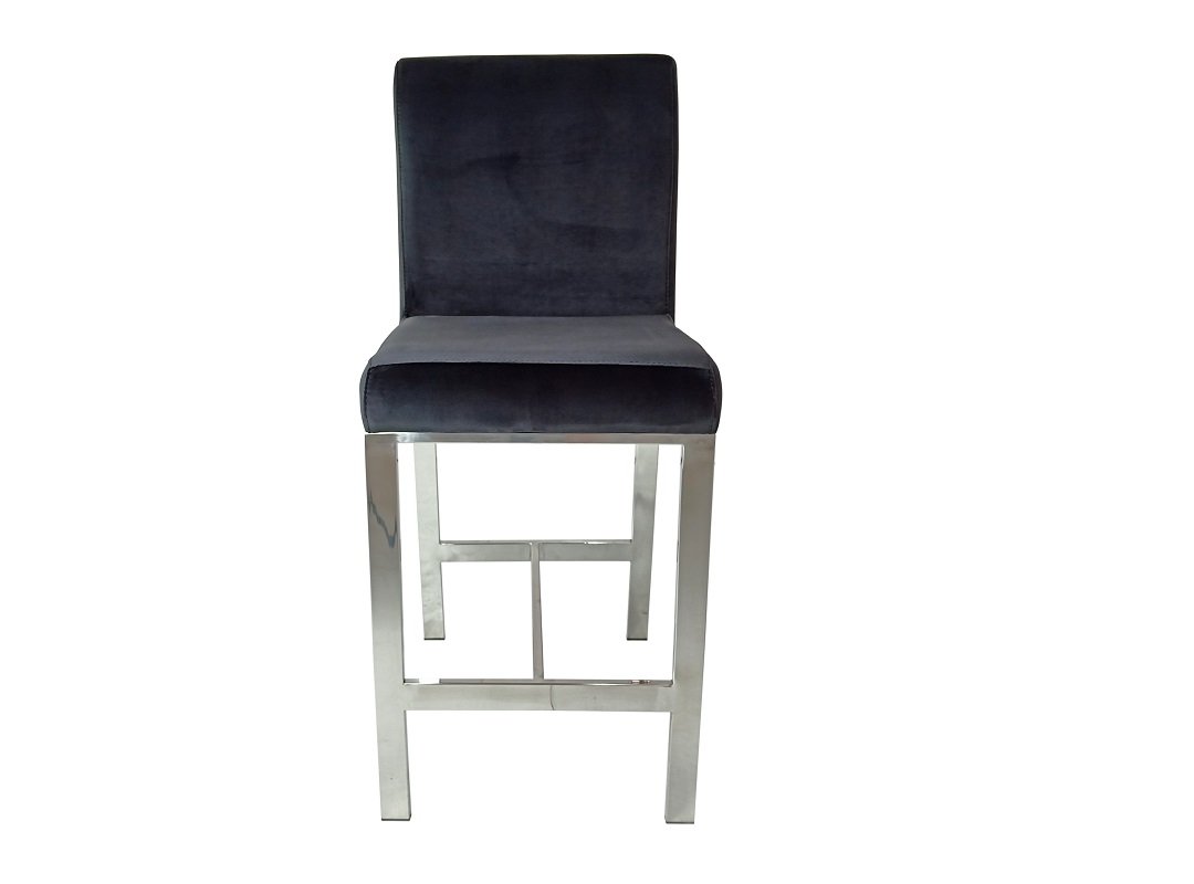 This counter-height chair features a plush velvet fabric upholstered seat with polished silver stainless steel laser-cut back in a unique shattered abstract pattern. The base of the chair is crafted in matching silver stainless-steel with four vertical straight legs.