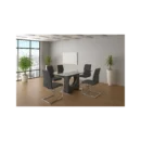 The Victory Dining Chairs complement the table’s aesthetic beautifully. Each chair is upholstered in smooth grey leatherette with a stitched vertical seam design for added texture and comfort. The sturdy chrome metal frame ensures durability and balance, making the set ideal for both family dining and elegant entertaining.