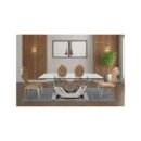 Elevate your dining room with the Crescent & Juliet Crystal-Chrome Dining Set. The Crescent Dining Table showcases a pristine 15 mm thick tempered glass top with safety-minded rounded corners, poised over twin crescent-shaped pedestals and a sleek platform base in polished silver stainless steel. Paired with it, six Juliet Dining Chairs bring plush comfort in mocha velvet, featuring a refined button-tufted oval back, a sturdy polished stainless-steel frame and legs, and a matching rear carrying handle for easy repositioning. The result is a bright, contemporary centerpiece that blends airy transparency with metallic glamour.