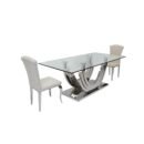 Introduce refined modernity to your dining room with the Crescent & Lincoln Chrome Harmony Dining Set. The Crescent Dining Table presents a crystal-clear 15mm tempered glass top with softly rounded corners for both style and safety. Its signature dual crescent-shaped stainless-steel pedestals and polished silver platform base create a striking, airy centerpiece that captures light beautifully from every angle.