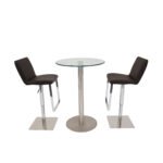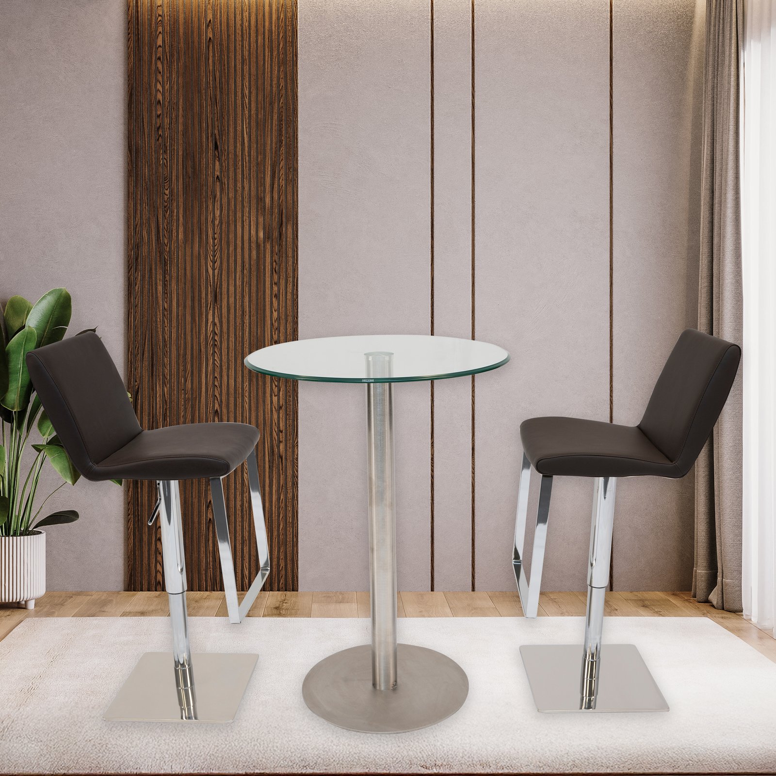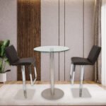 This round bar-height table features a 12mm thick tempered clear glass top with a brushed steel pedestal pole leg and matching round steel baseplate.