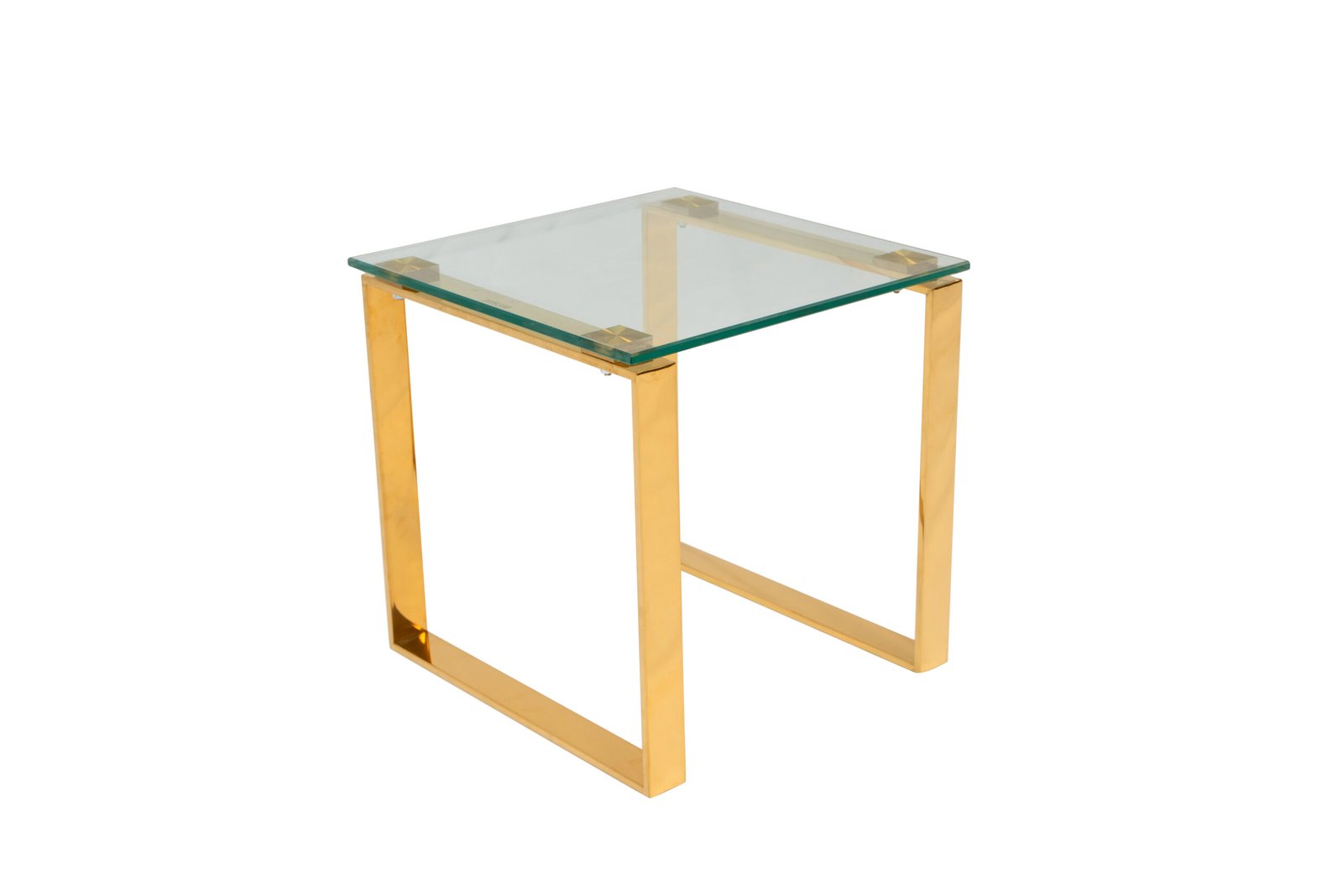 This end table features a 12mm thick tempered clear glass top with two sturdy gold chrome finished metal leg frames for support.