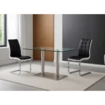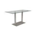 This rectangular table features a 12mm thick tempered clear glass top with a base that consists of two brushed stainless-steel pedestal pole legs and a matching flat rectangular stainless-steel baseplate.