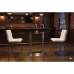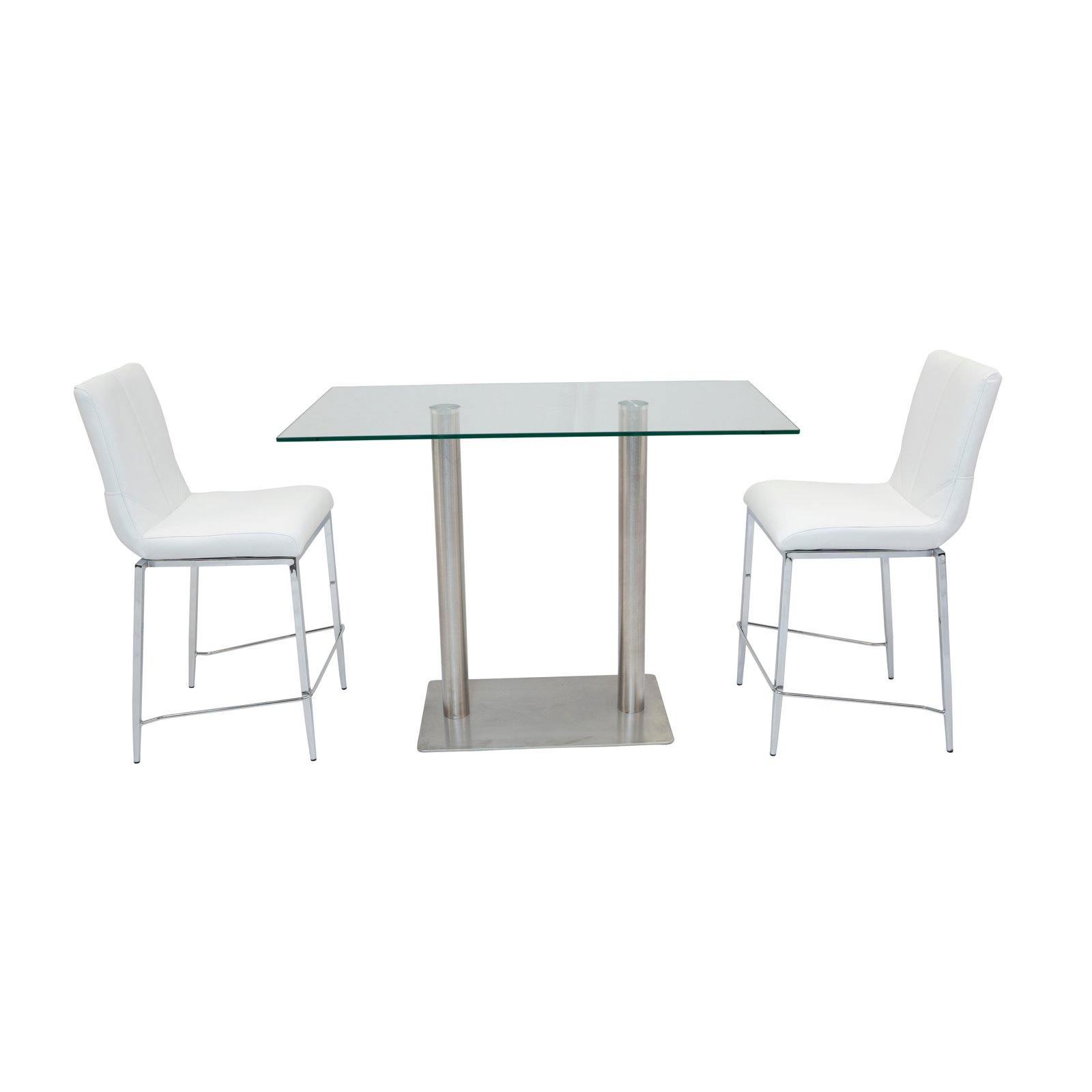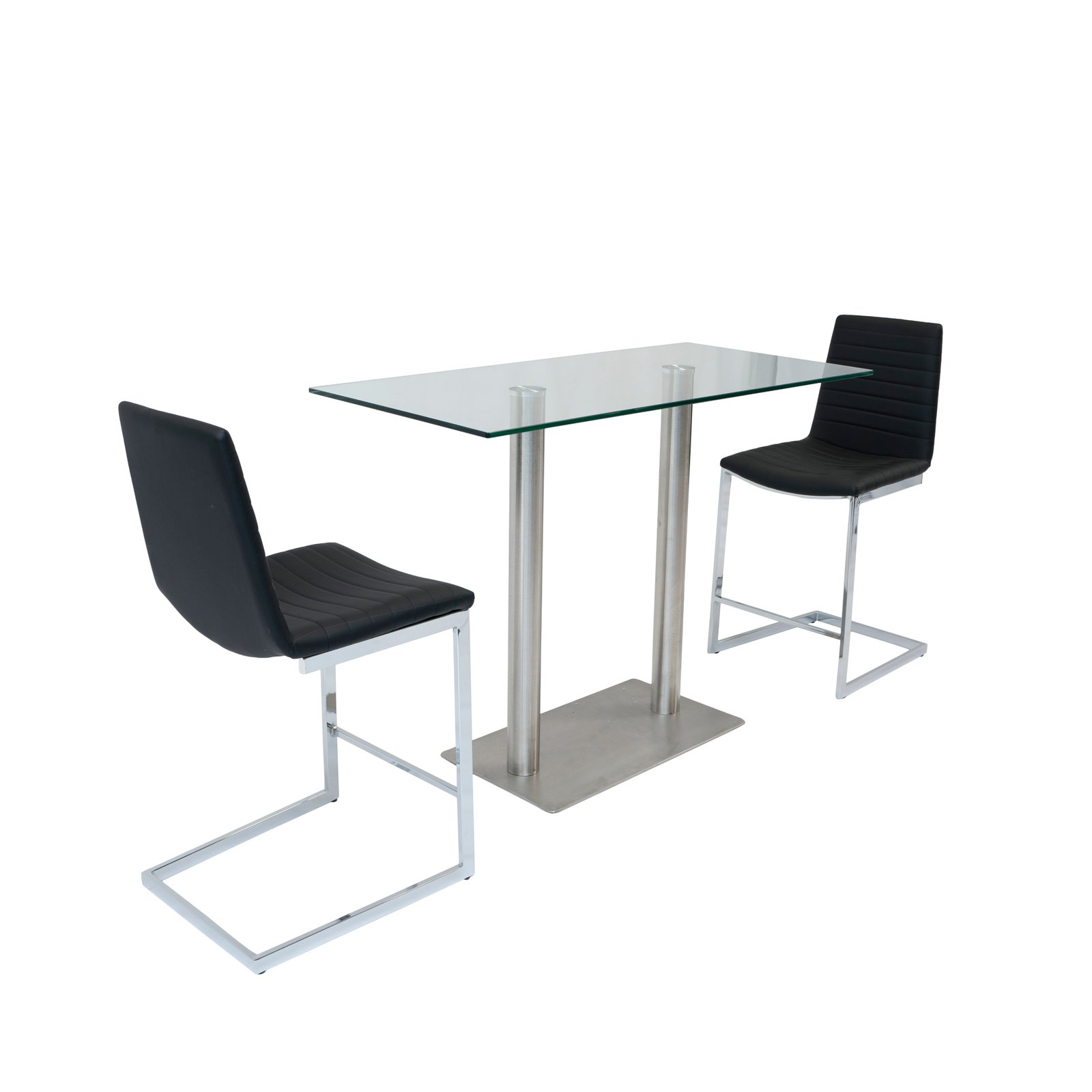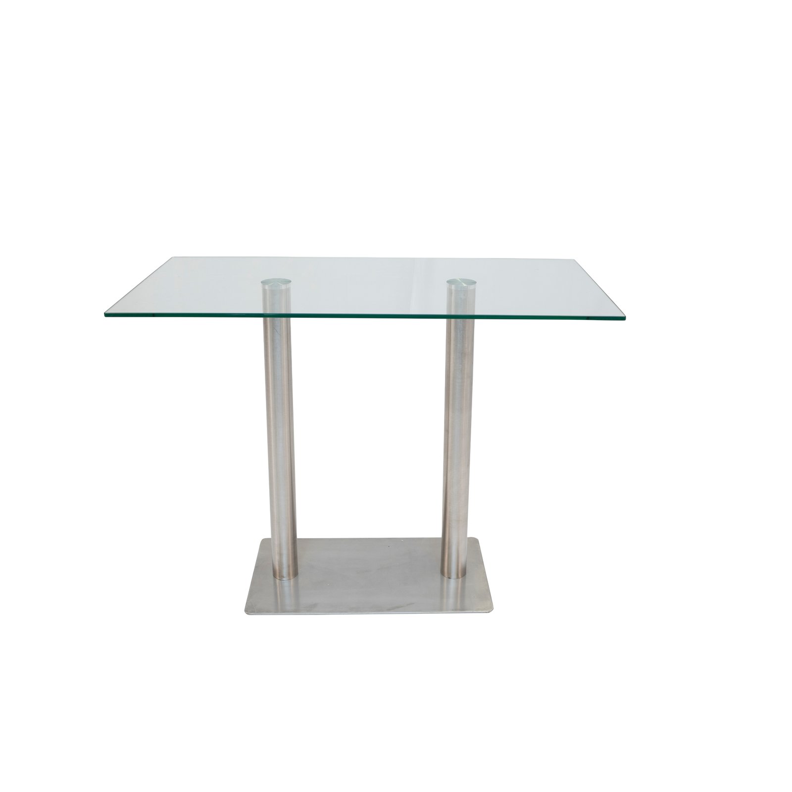This rectangular pub-height table features a 12mm thick tempered clear glass top with a base that consists of two brushed stainless-steel pedestal pole legs and a matching flat rectangular stainless-steel baseplate.