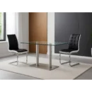 The set is paired with the striking Texas Dining Chair, designed for comfort and modern styling. The chair includes a padded black leatherette seat enhanced with white leatherette accents and a square-pattern quilted back design. The silver chrome metal base frame ensures durability while perfectly complementing the table’s stainless-steel finish. Together, this set brings an upscale yet functional aesthetic to any dining space.