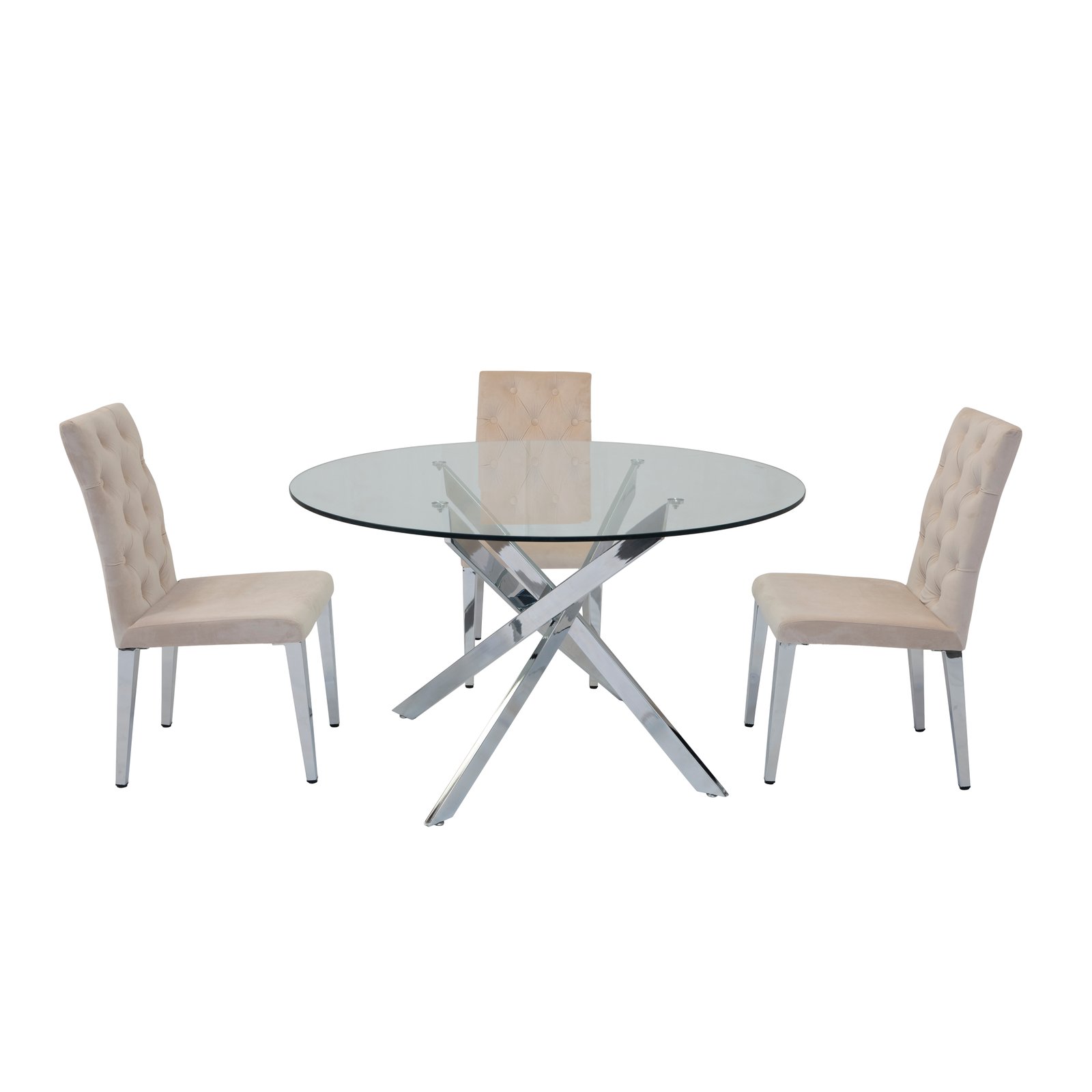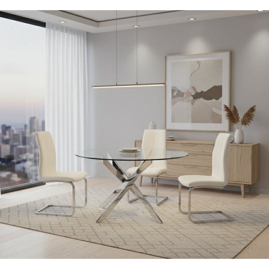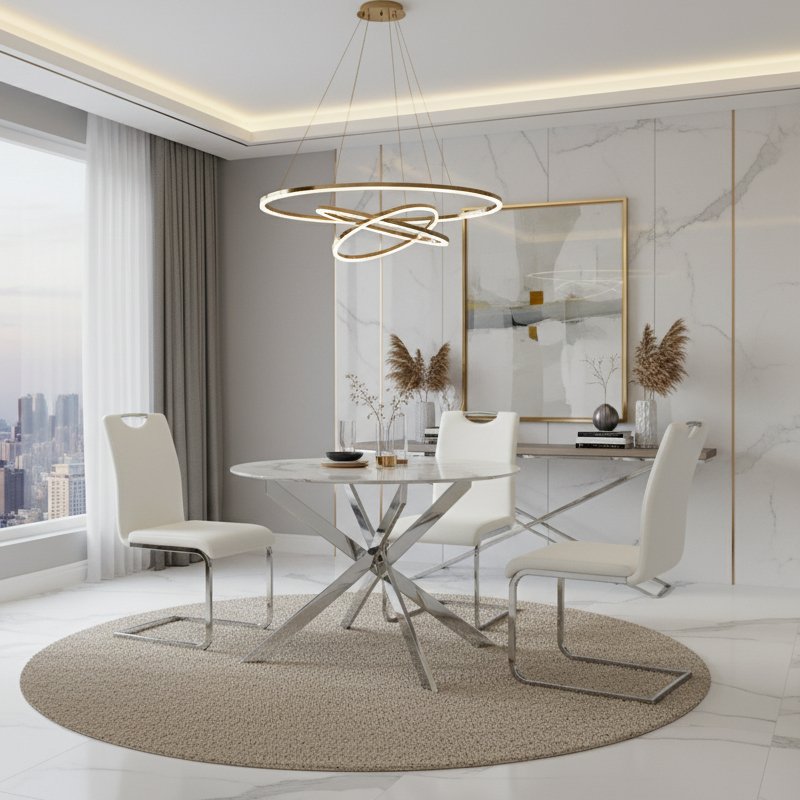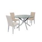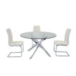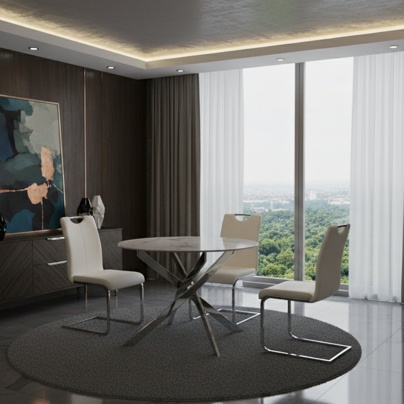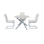 Give your dining space a refined modern upgrade with the Genesis & Monalisa Marble Round Dining Set. The Genesis Round Dining Table (Marble Finished Glass/Silver) showcases a 12mm thick tempered glass top with a marble finish, combining the elegant look of stone with the lightness and practicality of glass. Four curved silver chrome finished metal legs meet in a sturdy, stylish crossed design, offering excellent stability in both 39″ and 51″ diameters to suit different room sizes.