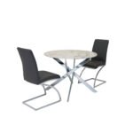 Completing the look, the Monalisa Dining Chairs bring clean lines and everyday comfort. Each chair features a solid grey leatherette upholstered seat with a shoulder-height backrest for support and a distinctive Z-shaped base frame crafted from sturdy silver chrome finished metal. The combination of marble-finish glass, chrome details, and minimalist seating creates a chic, cohesive contemporary ensemble.