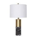 Features: Table lamp with round 2-tone brass/marble finished body design and linen shade