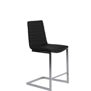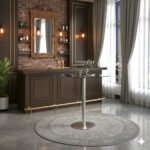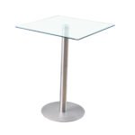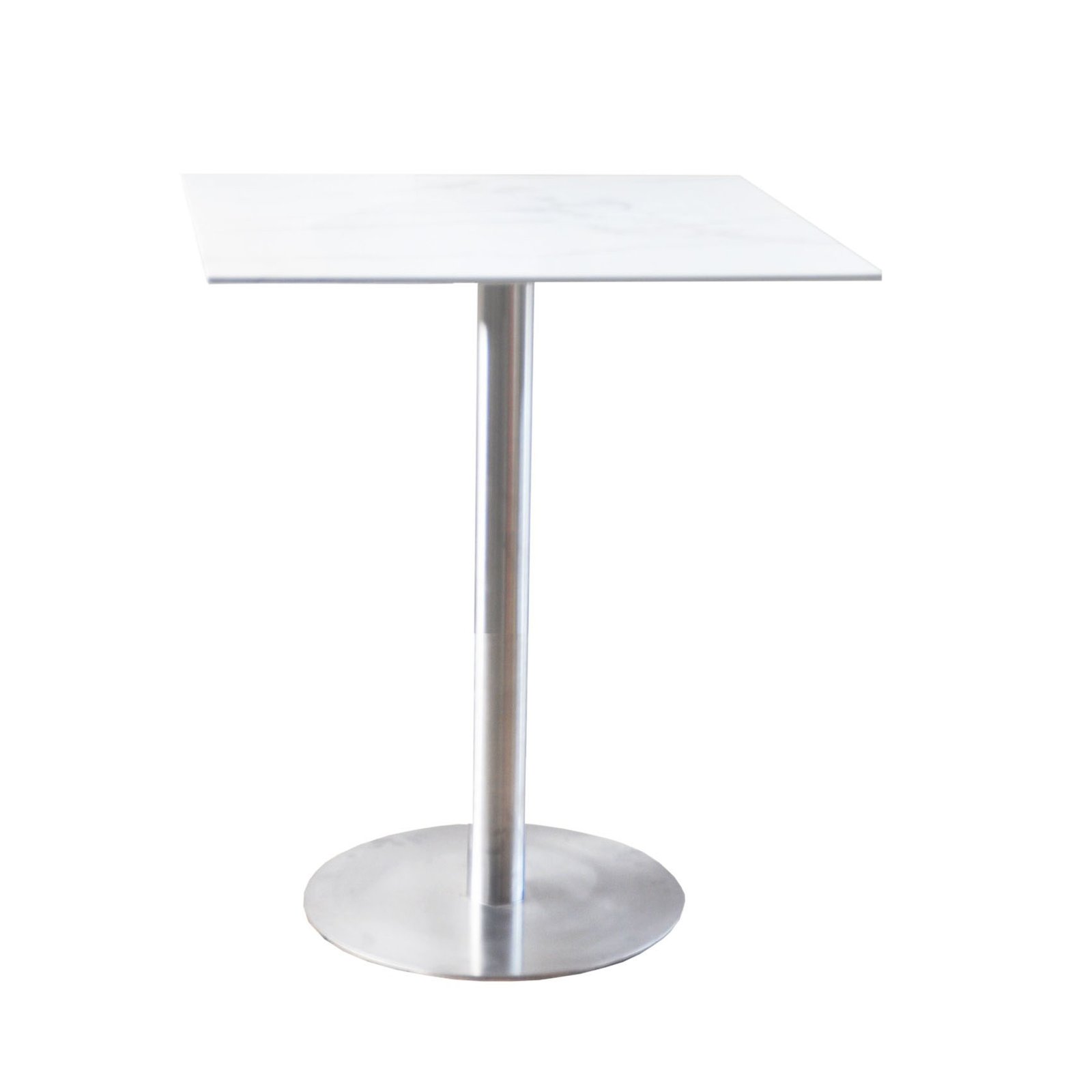 This square bar-height table features a marble finished 12mm thick tempered glass top supported by a base that consists of a brushed stainless-steel pedestal pole and round baseplate.