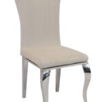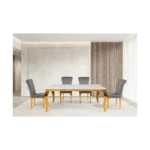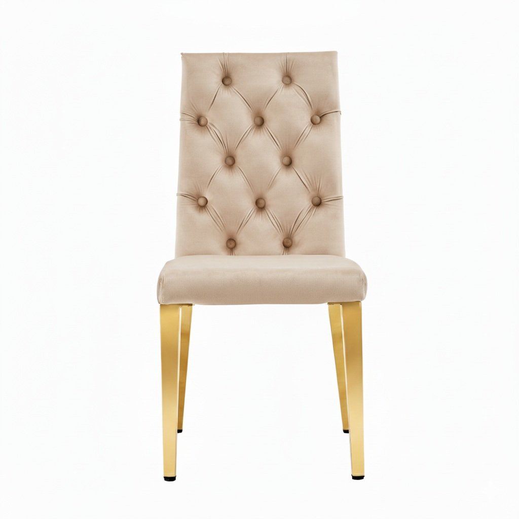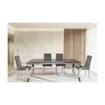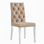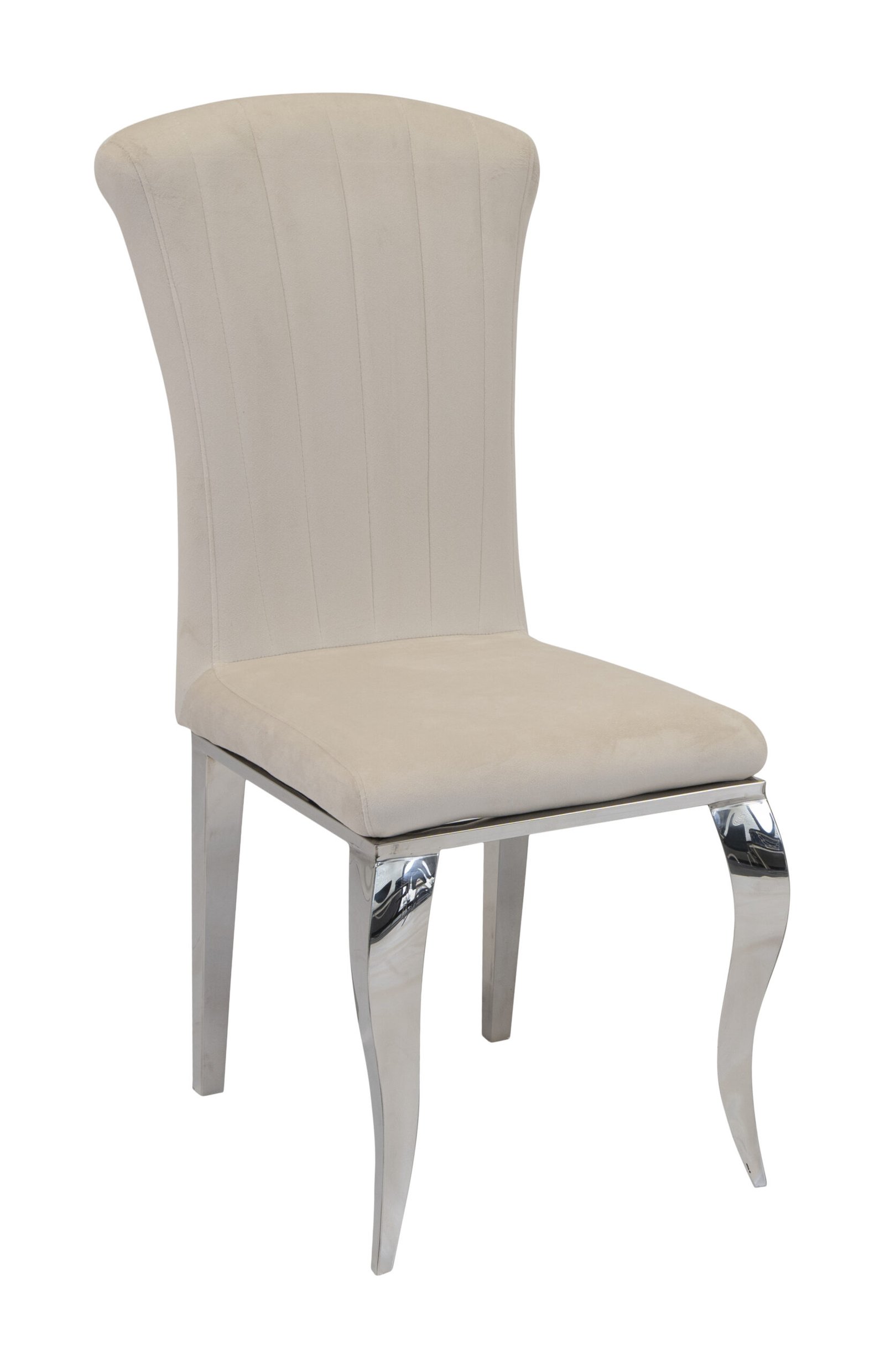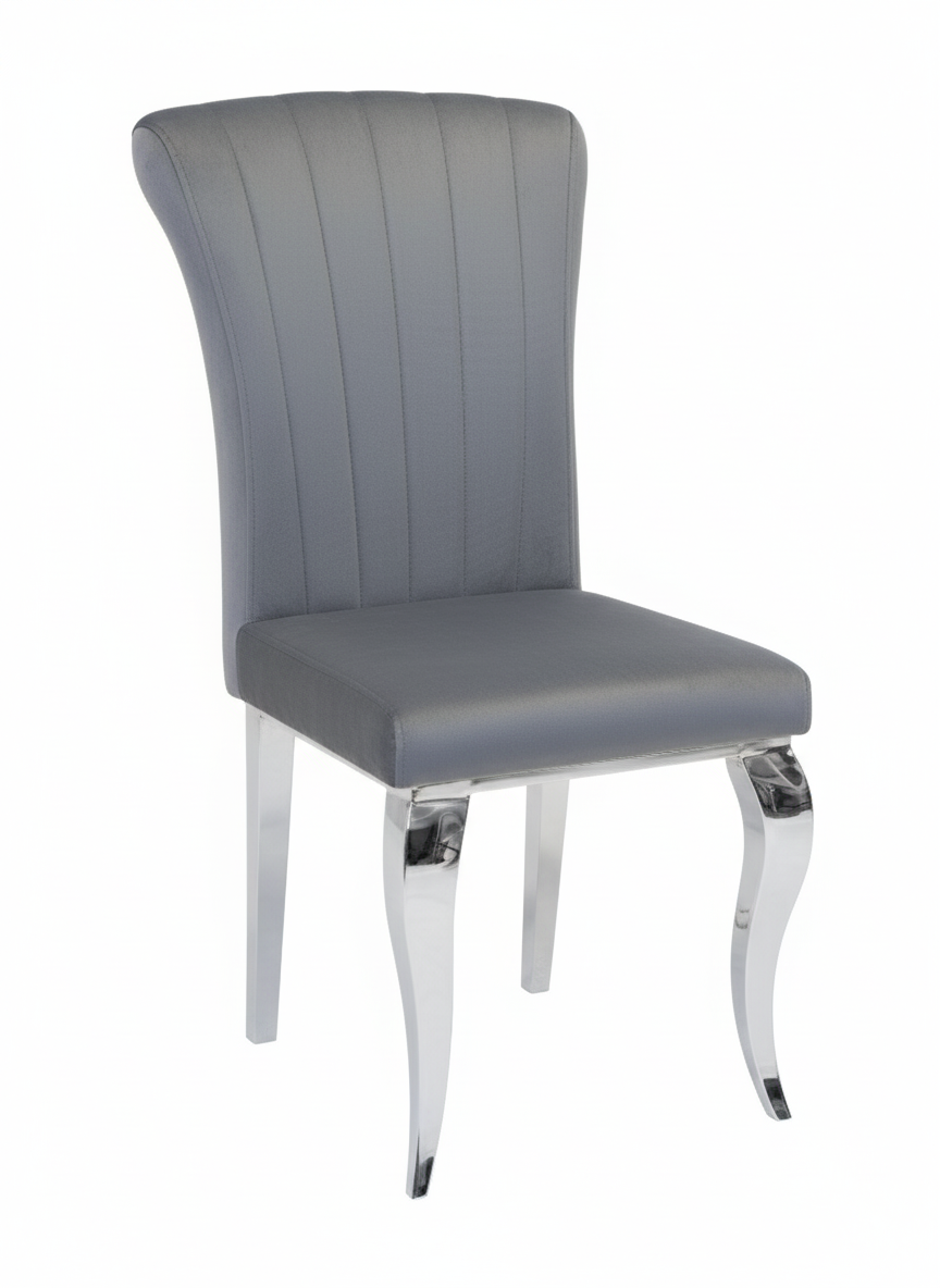 Completing the ensemble, six Lincoln Dining Chairs offer plush comfort with velvet upholstery, a supportive shoulder-height back, and a soft vertical stitched pattern. Their chrome-finished metal frame with cabriole-style legs echoes the table’s contours for a cohesive, elevated look.