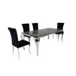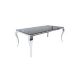 Bring classic poise to modern dining with the Imperial & Lincoln Glass Dining Set. The Imperial Glass Rectangular Dining Table showcases a sleek 12 mm black tempered glass top supported by a polished stainless-steel frame and graceful cabriole-style legs. Its refined silhouette and reflective surfaces create a sophisticated focal point that complements both contemporary and traditional interiors.