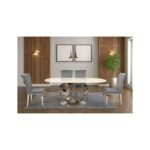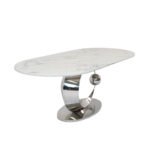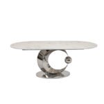 This table features an oval marble top with a polished silver stainless-steel moon-shaped pedestal and matching stainless-steel oval platform base.