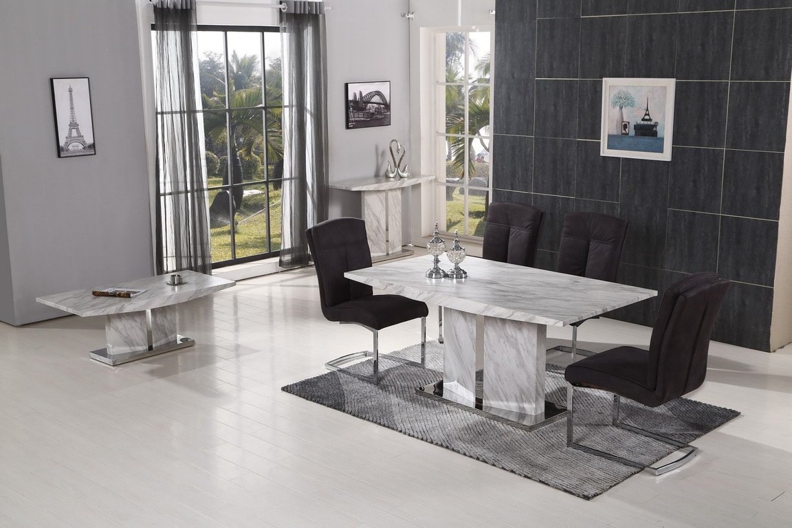 This end table features a square MDF tabletop with a faux marble finish and is supported by a matching faux marble pedestal with silver stainless steel accents and a polished silver stainless steel platform base.