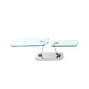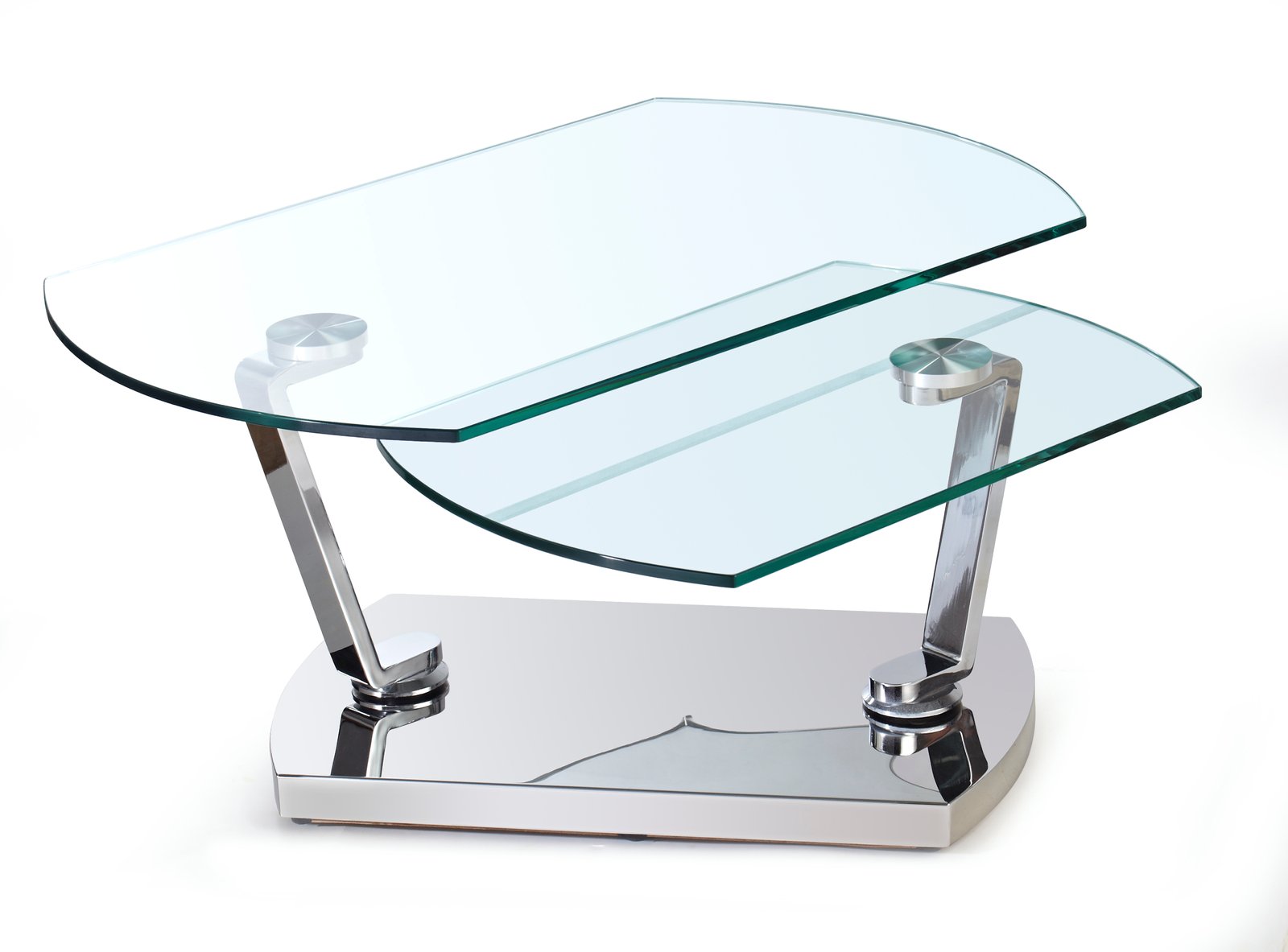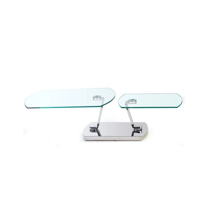 This coffee table features two stadium-shaped rectangular 12mm thick tempered clear glass tabletops supported by crowbar-style swivelling stainless steel pedestals allowing the table to extend to accommodate larger gatherings, and a matching polished silver stainless steel platform base.
