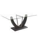 This coffee table features a rectangular 12mm thick tempered clear glass tabletop supported by two elegantly contoured MDF pedestals in rich charcoal dark wood and a silver chrome metal accent support frame that adds a refined touch and style with a matching wood veneer platform base. This piece perfectly blends modern design with timeless craftsmanship, making it a great fit for contemporary or transitional interiors.