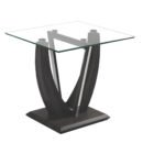 This end table features a 12mm thick tempered clear glass tabletop supported by two elegantly contoured MDF pedestals in rich charcoal dark wood and a silver chrome metal accent support frame that adds a refined touch and style with a matching wood veneer platform base. This piece perfectly blends modern design with timeless craftsmanship, making it a great fit for contemporary or transitional interiors.