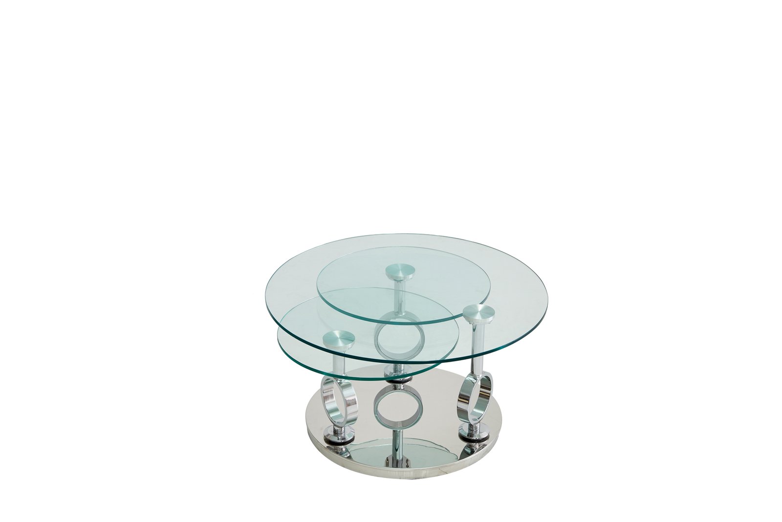 This coffee table features three round 12mm thick tempered clear glass tabletops that are supported by three vertical stainless-steel pedestals with an integrated stylish ring-design and a swivel mechanism that allows the table to extend to accommodate larger gatherings. The platform base is also crafted from matching polished silver stainless steel.