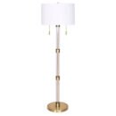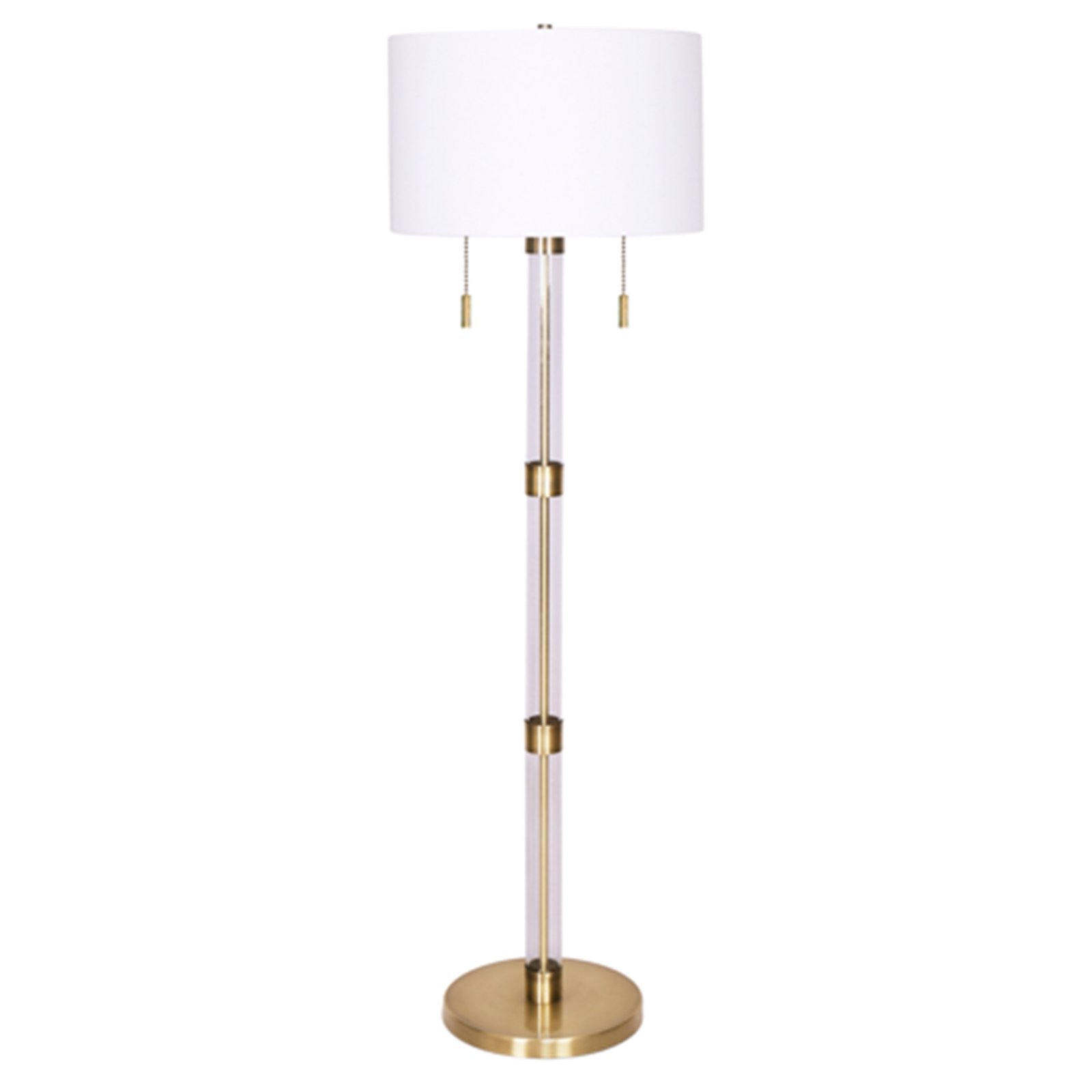 Features: Floor lamp with see-through tubular glass shell, slender body design with brass accents and a linen shade that accommodates two bulbs with individual power control