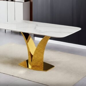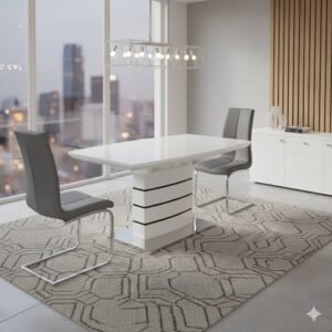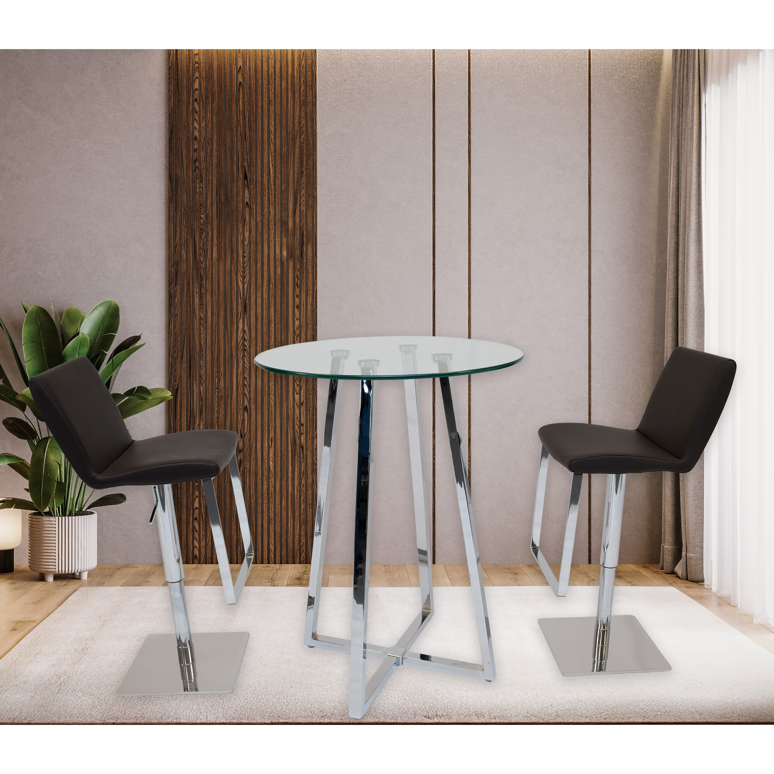 The set is complemented by the sophisticated Olivia Barstool, upholstered in dark brown genuine leather and designed for both comfort and luxury. It includes a supportive backrest, smooth 360° swivel, and an easy hydraulic height adjustment mechanism ranging from 21″ to 31″. A polished stainless steel square baseplate and durable metal footrest ensure stable seating and a clean, modern finish. Together, this set delivers style, practicality, and long-lasting comfort.