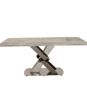 This round bar-height table features a 12mm thick tempered clear glass top with four silver chrome finished metal pedestal frame legs in a stylish X-shape design.