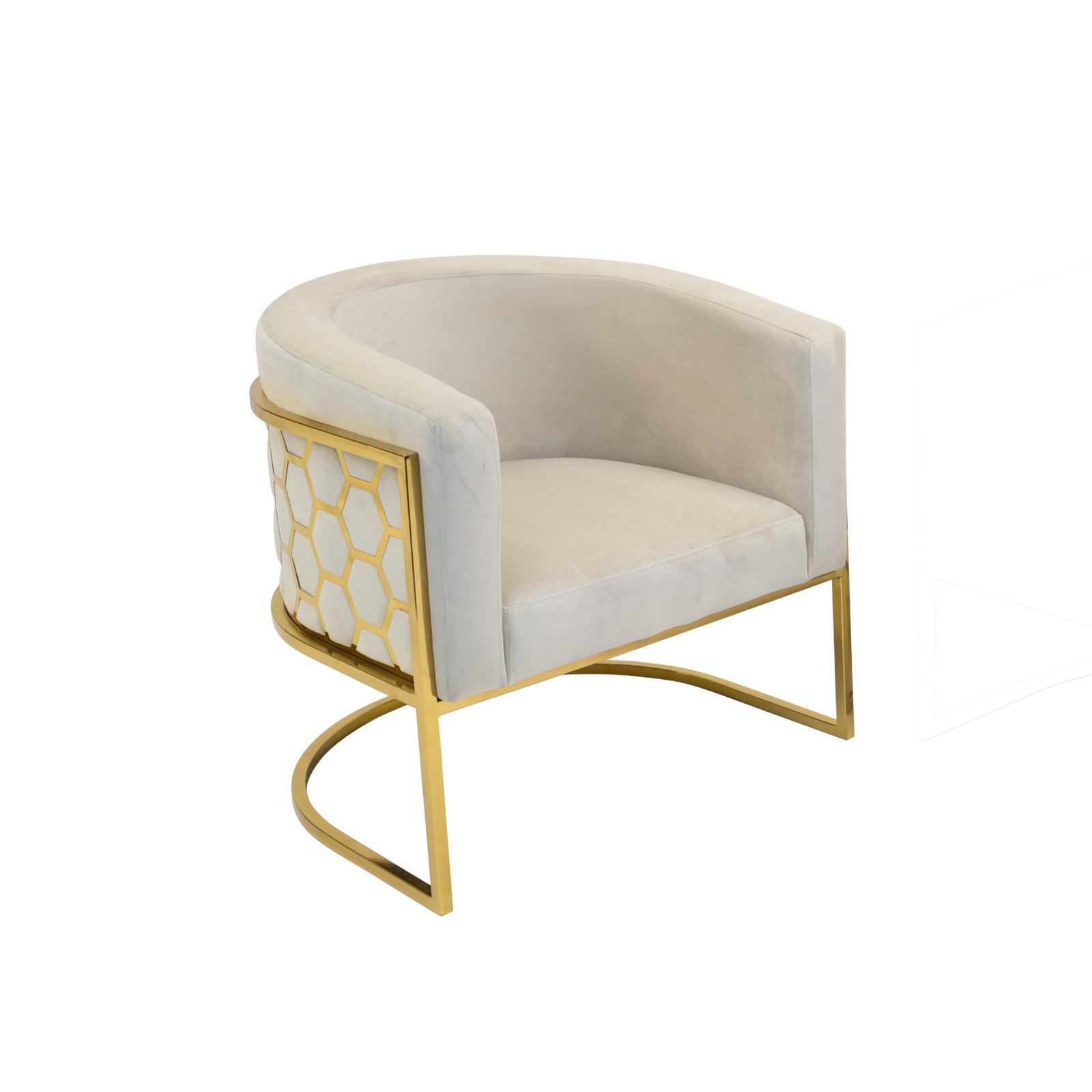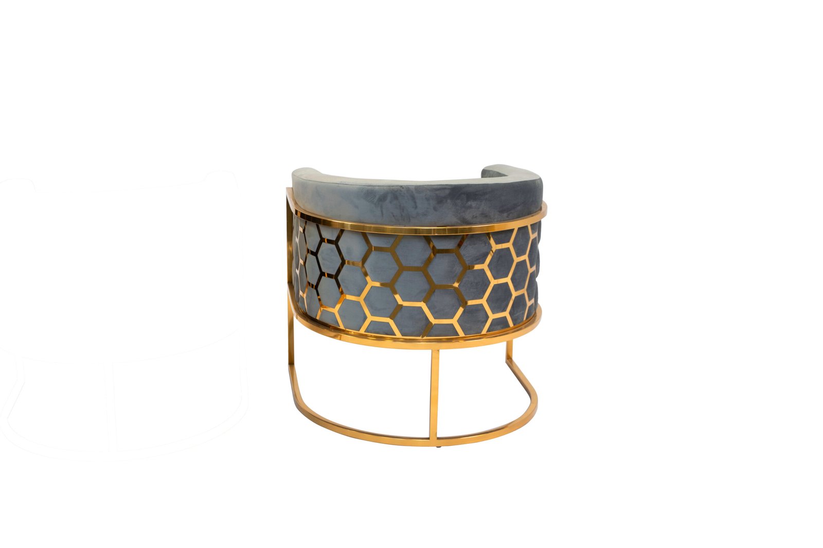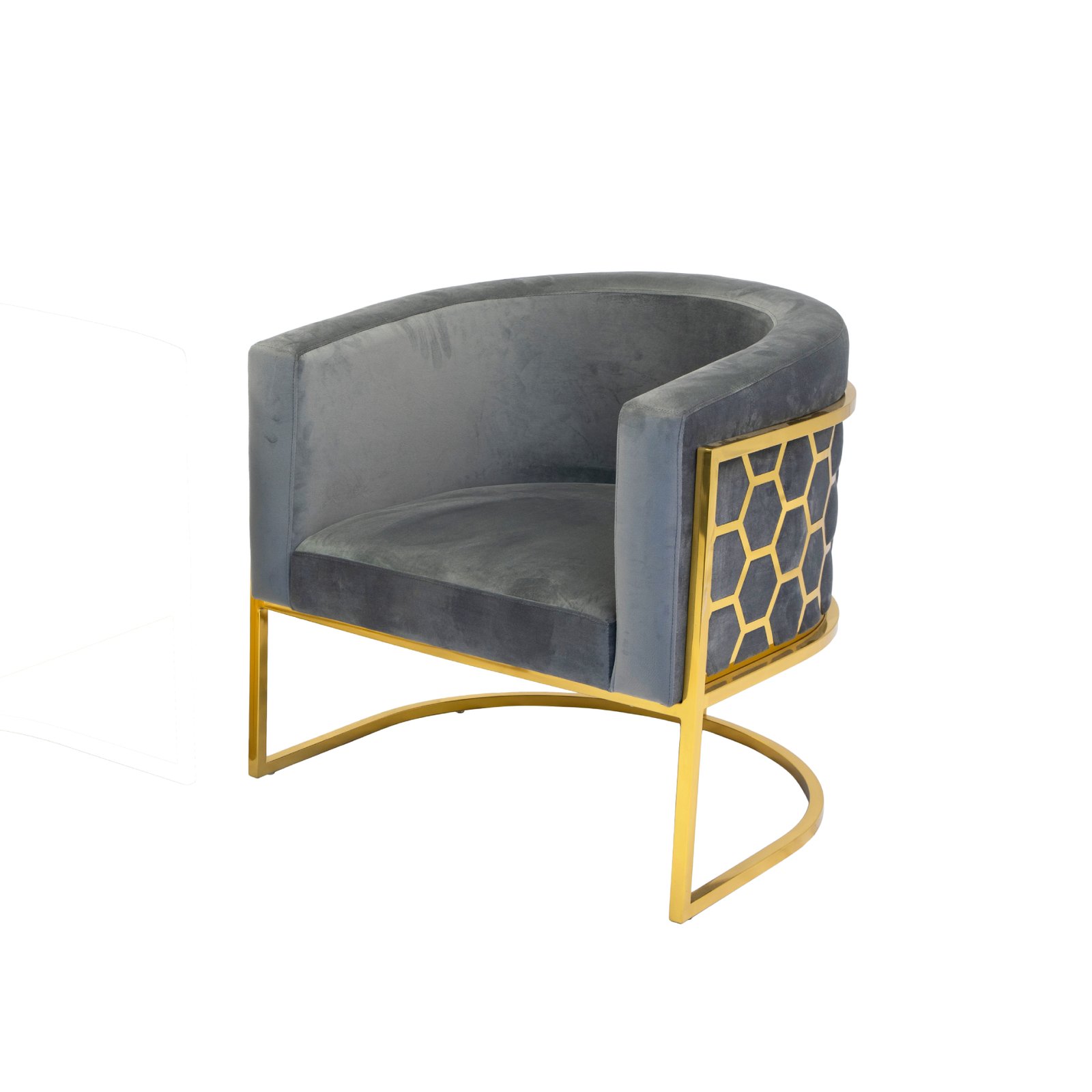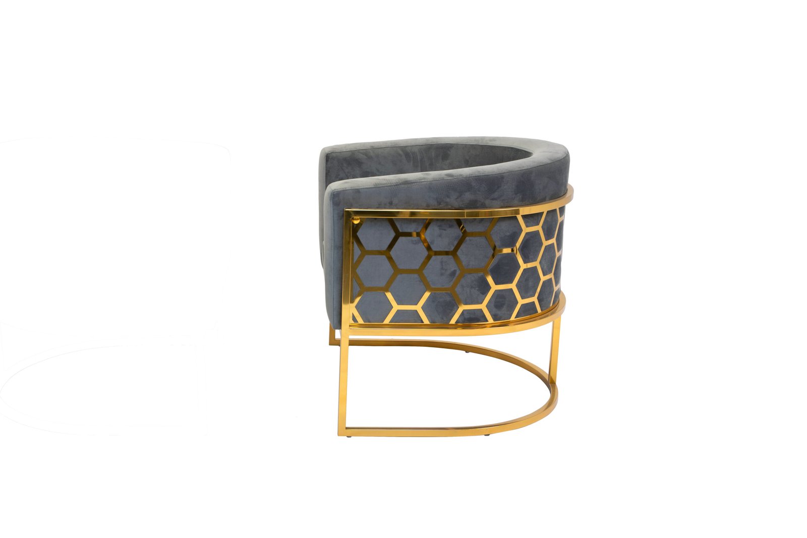 This accent chair features a plush and comfortable velvet fabric upholstered seat with a rounded backrest, integrated armrests and a laser-cut stainless-steel honeycomb-style pattern on the back. The leg frame is also crafted in matching polished silver or gold stainless-steel.