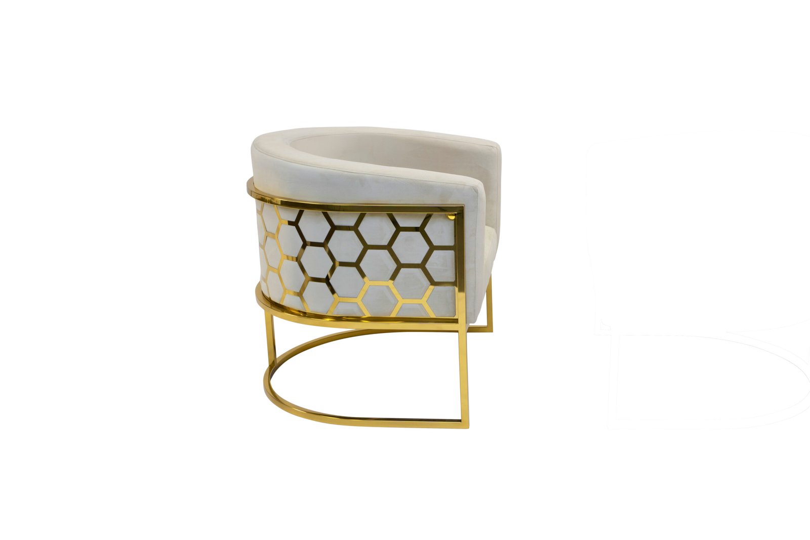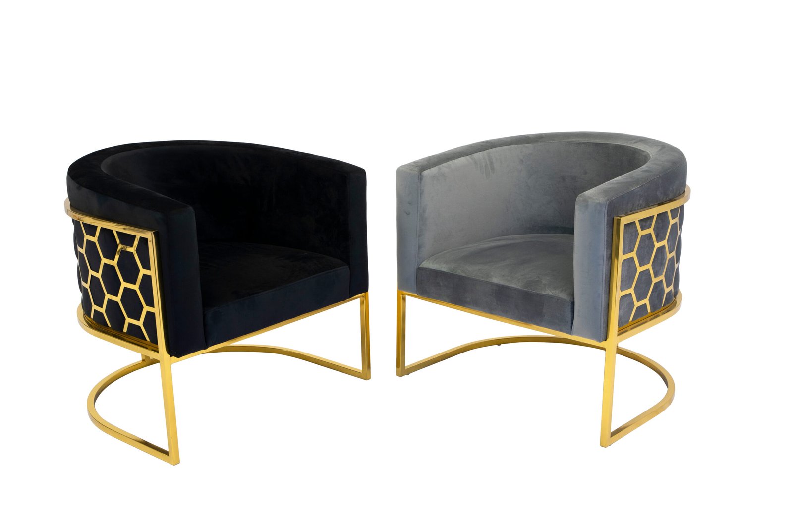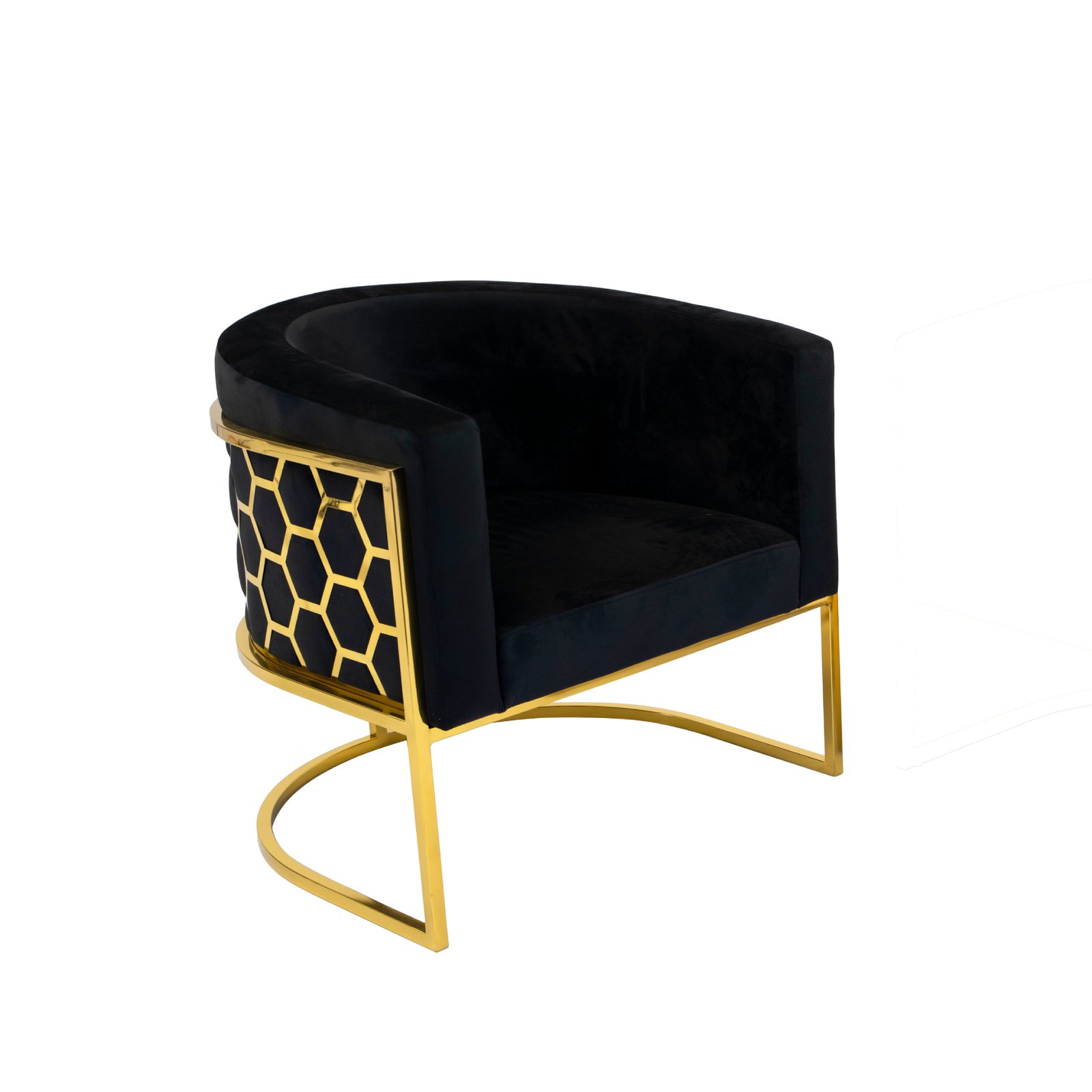 This accent chair features a plush and comfortable velvet fabric upholstered seat with a rounded backrest, integrated armrests and a laser-cut stainless-steel honeycomb-style pattern on the back. The leg frame is also crafted in matching polished silver or gold stainless-steel.