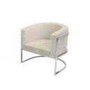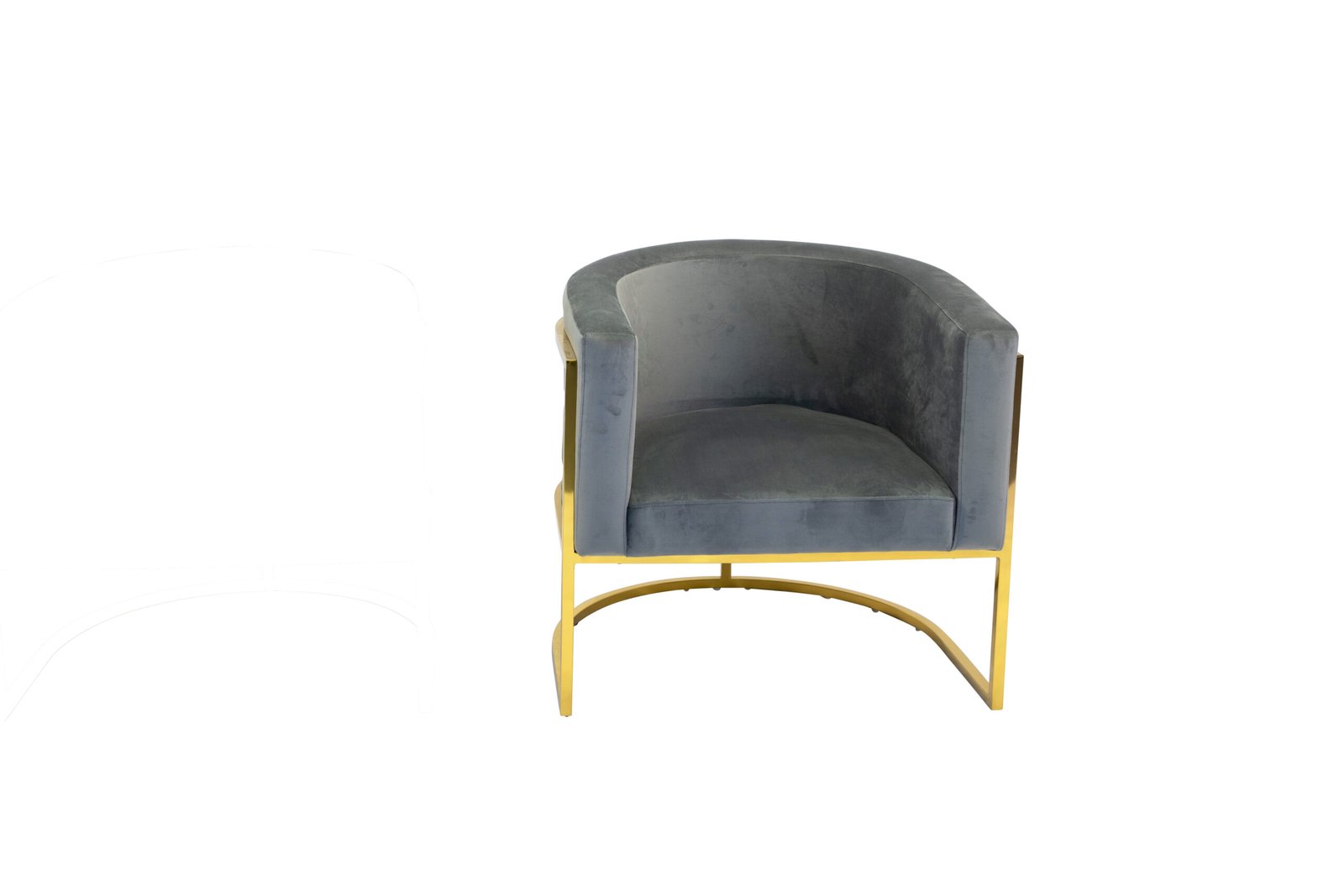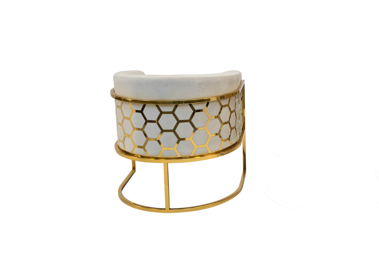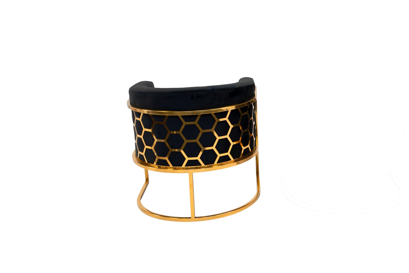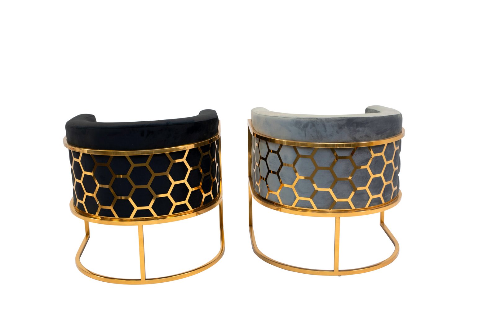 This accent chair features a plush and comfortable velvet fabric upholstered seat with a rounded backrest, integrated armrests and a laser-cut stainless-steel honeycomb-style pattern on the back. The leg frame is also crafted in matching polished silver or gold stainless-steel.