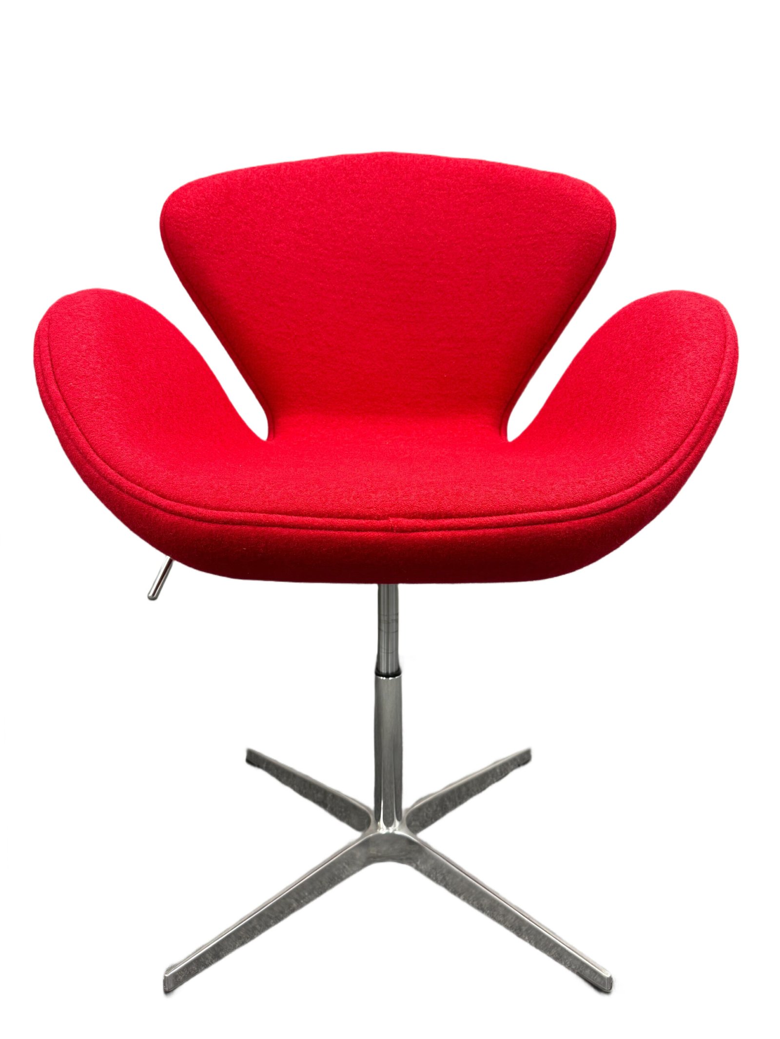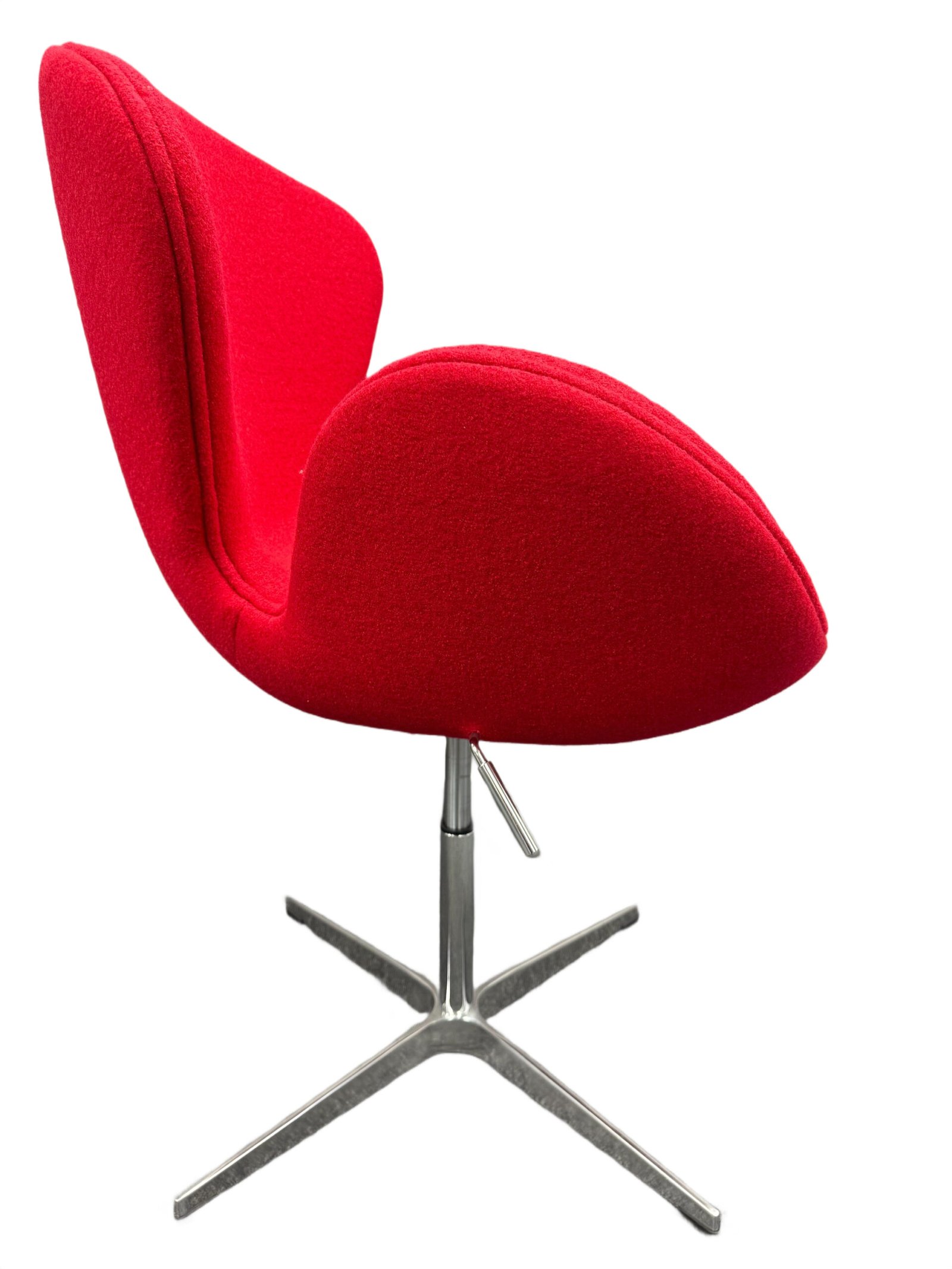 This accent chair features a comfortable cashmere fabric upholstered and contoured seat with integrated armrests and a medium height backrest that provides excellent support. The base is crafted from brushed silver aluminum and includes a swivel mechanism and height adjustable hydraulic functionality.