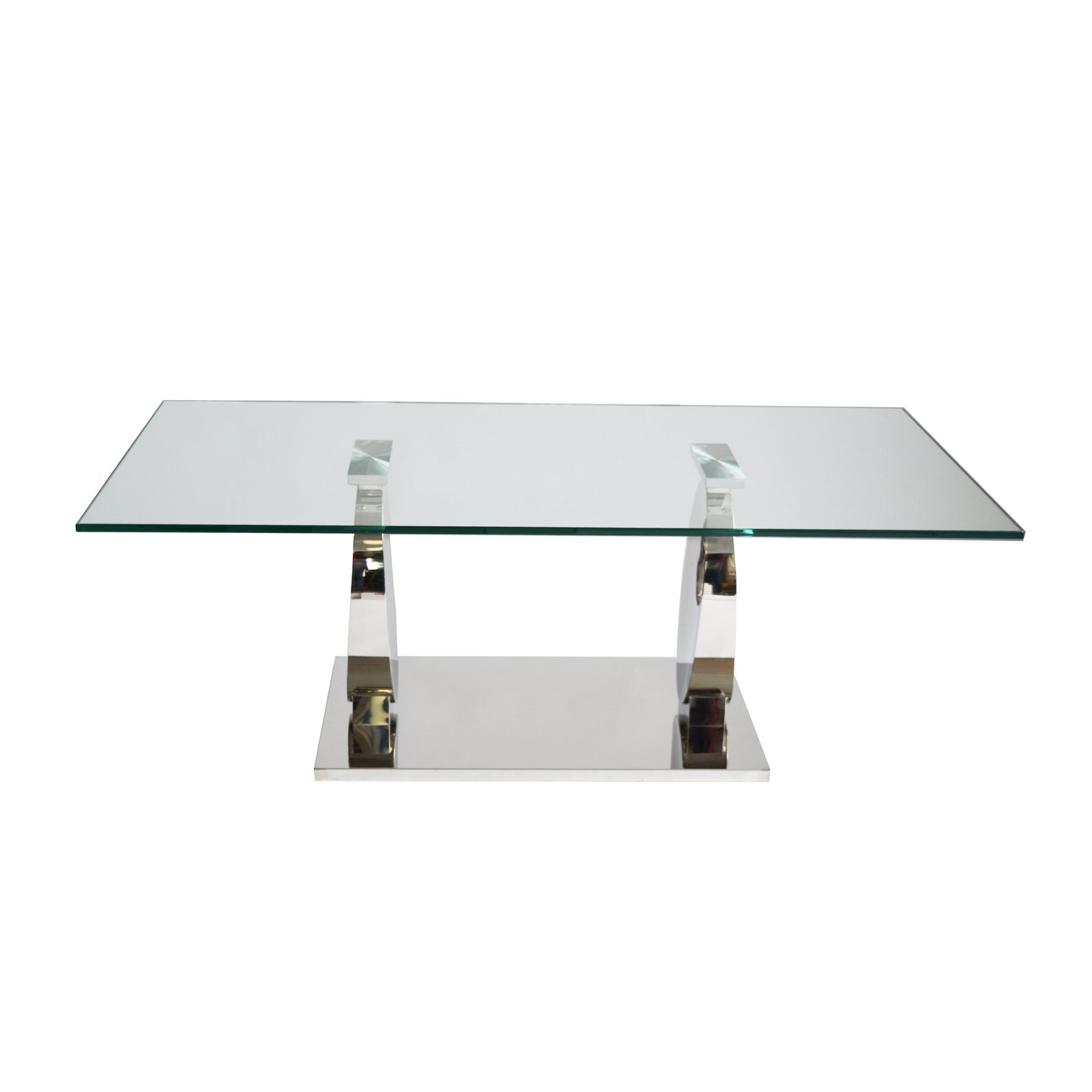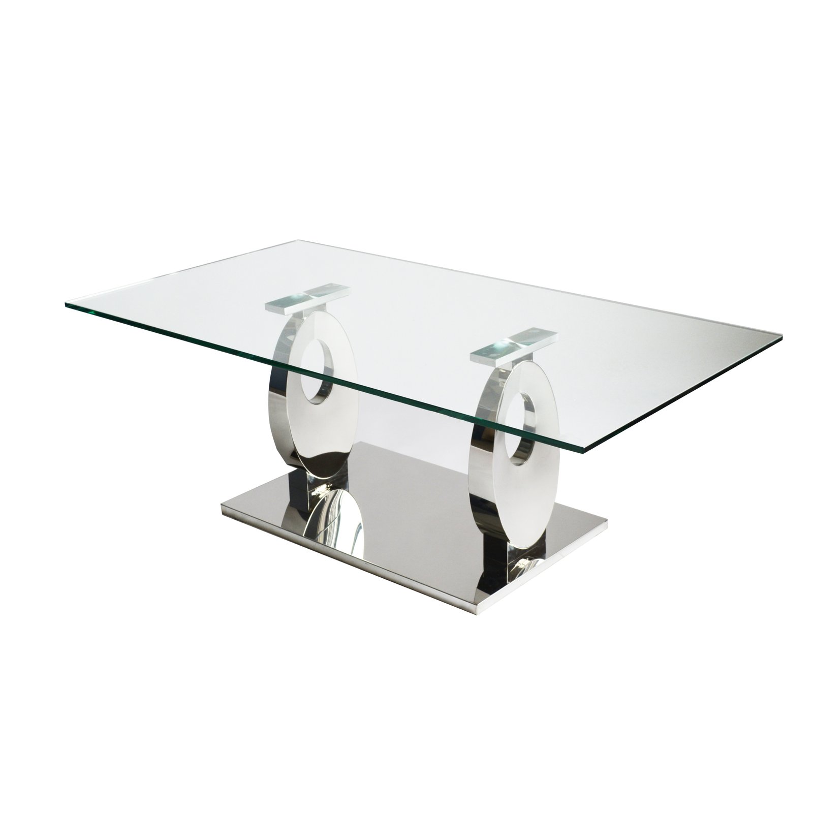 This coffee table features a rectangular 12mm thick tempered clear glass top supported by two oval-shaped stainless-steel pedestals with a hole cut-out design and a matching polished silver stainless steel platform base.