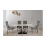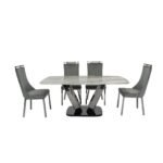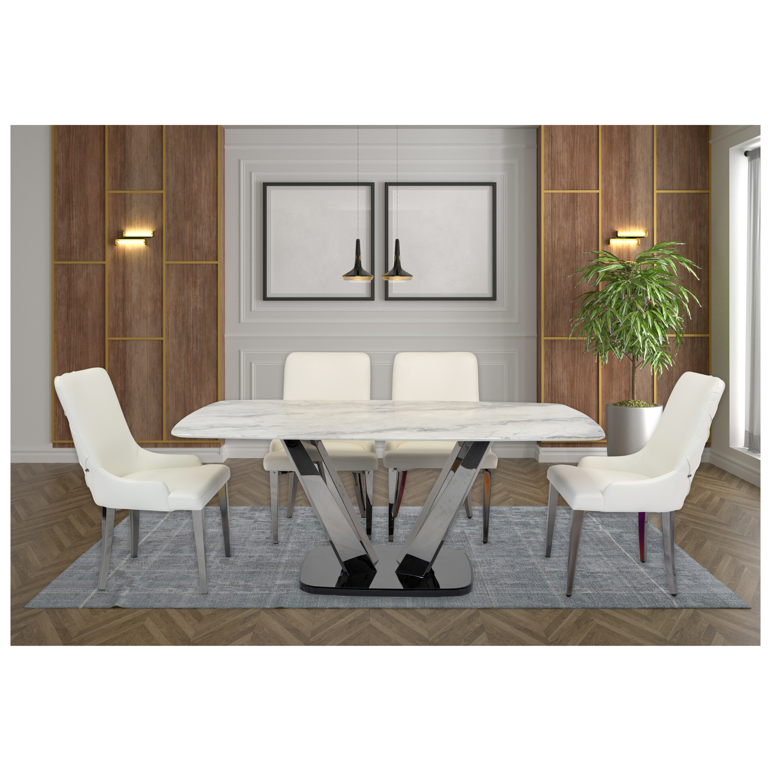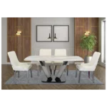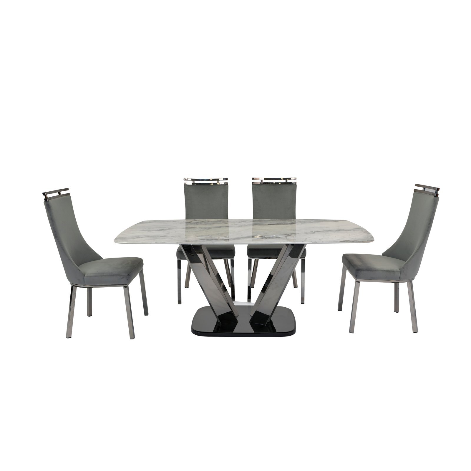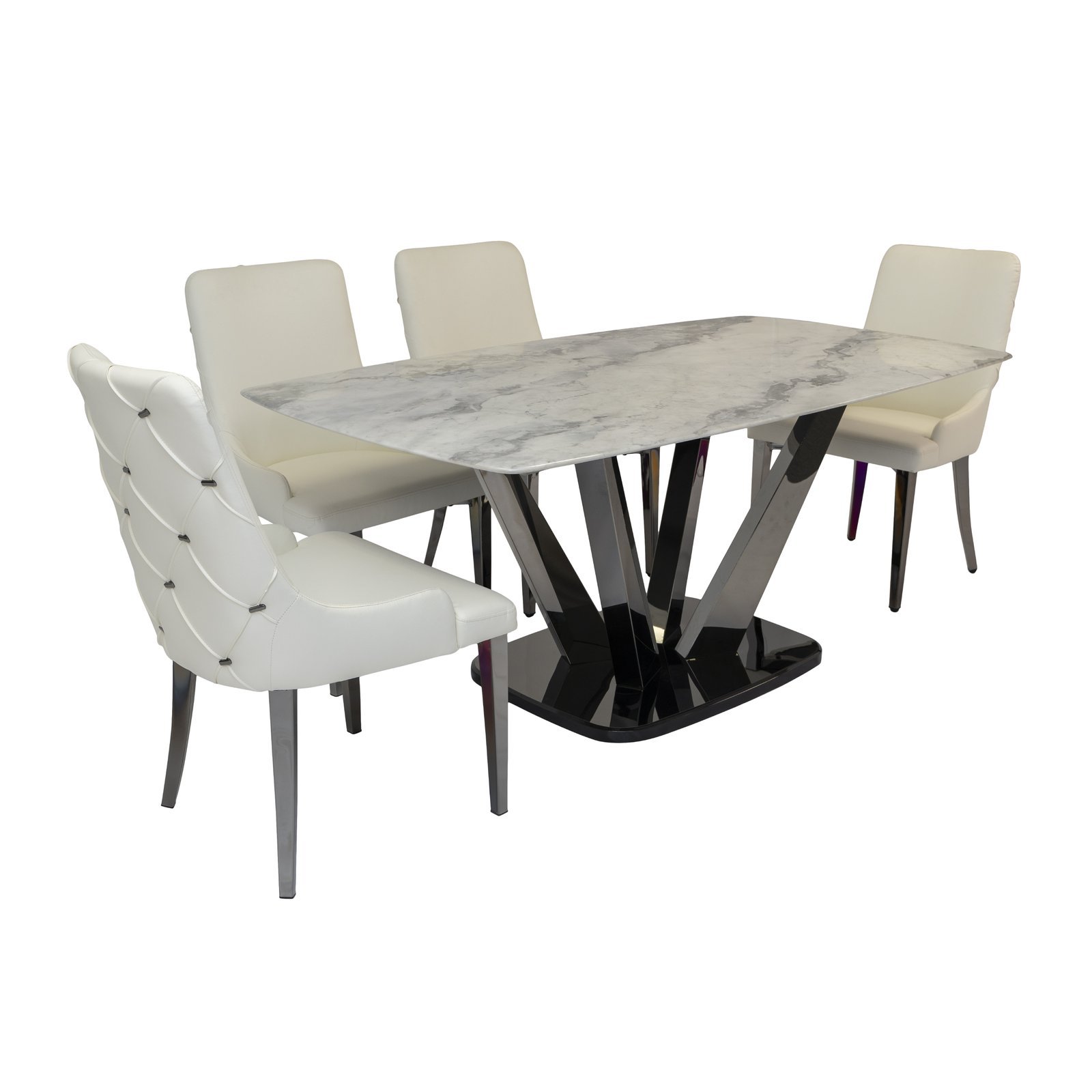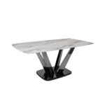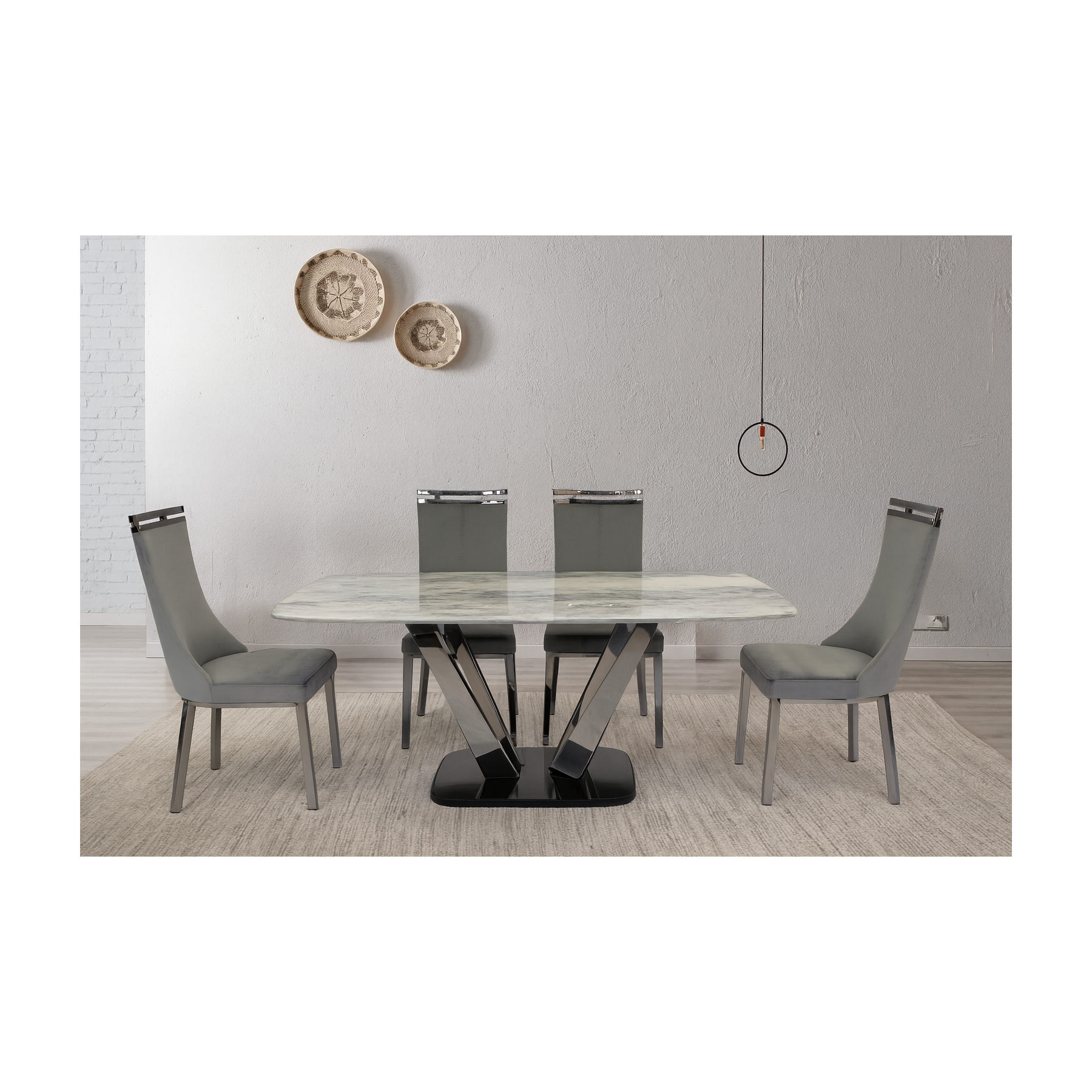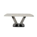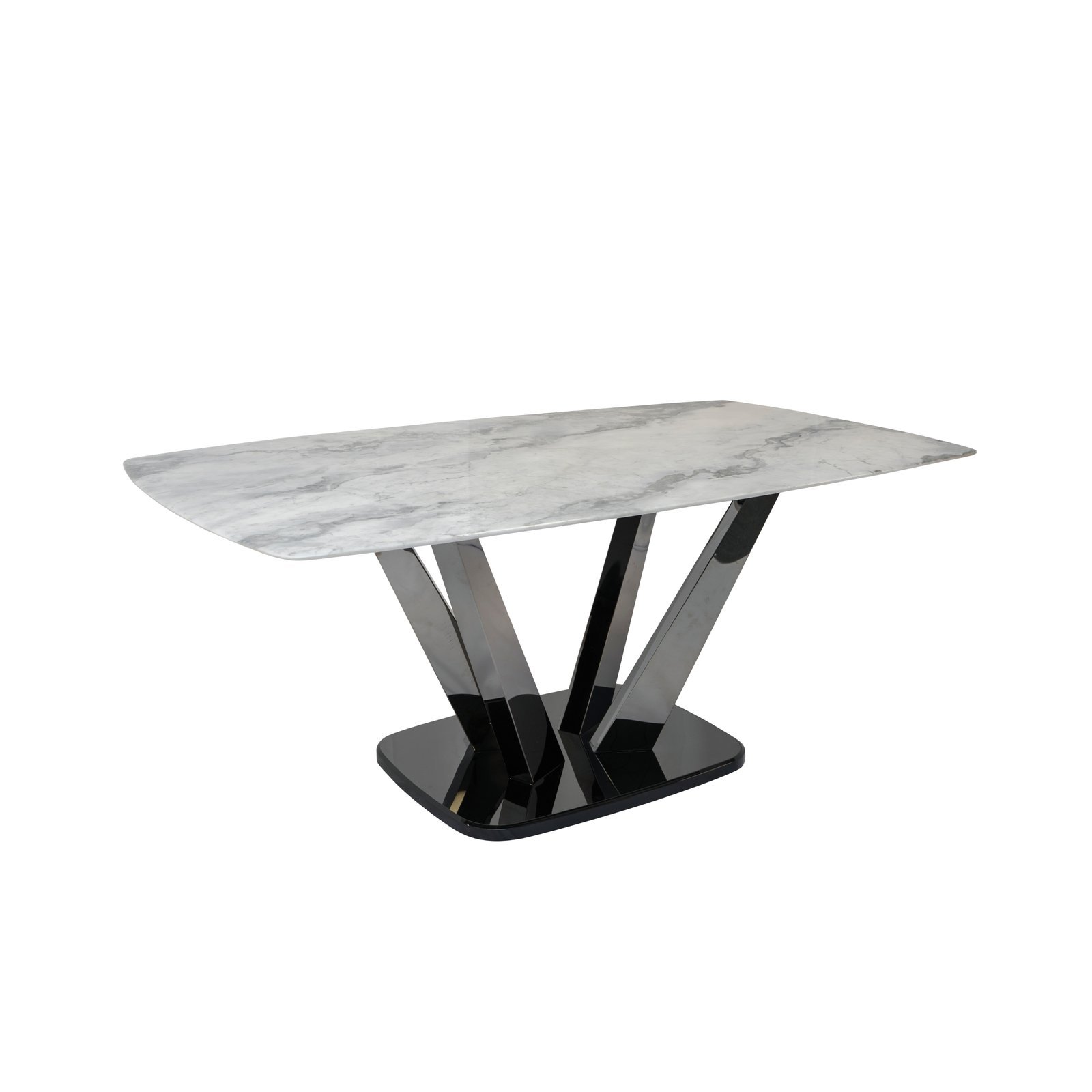 This table features an onyx marble top with rounded corners and a base that consists of four angled pedestal pillars in polished black nickel stainless steel with a matching stainless steel platform baseplate.