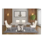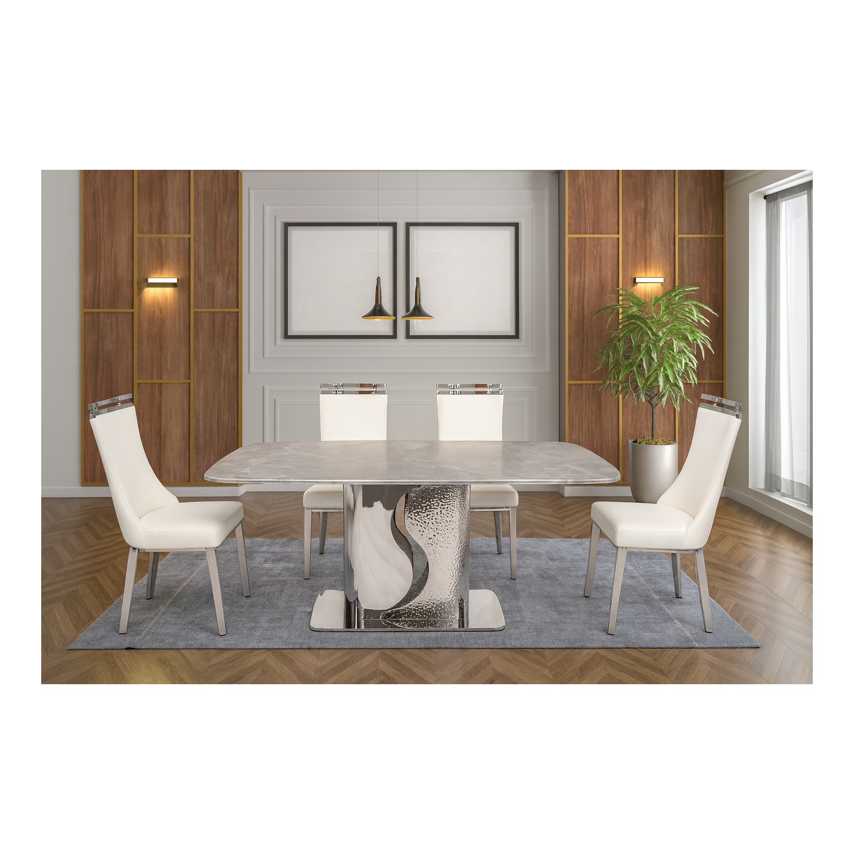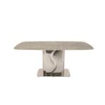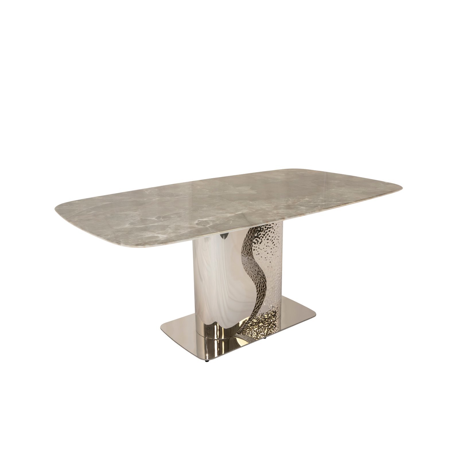 This table features an onyx marble top with rounded corners, polished silver stainless-steel pedestal with an embossed “bubble rain” texture and a flat rectangular-shaped stainless steel baseplate.