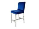 This counter-height chair features a plush velvet fabric upholstered seat with polished silver stainless steel laser-cut back in a unique shattered abstract pattern. The base of the chair is crafted in matching silver stainless-steel with four vertical straight legs.