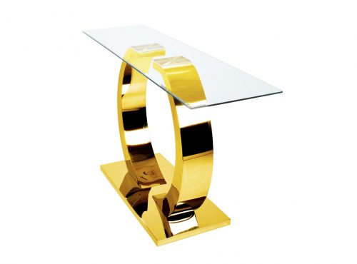 - Clear tempered glass top, Middle leg and base made of gold finish Stainless-Steel.