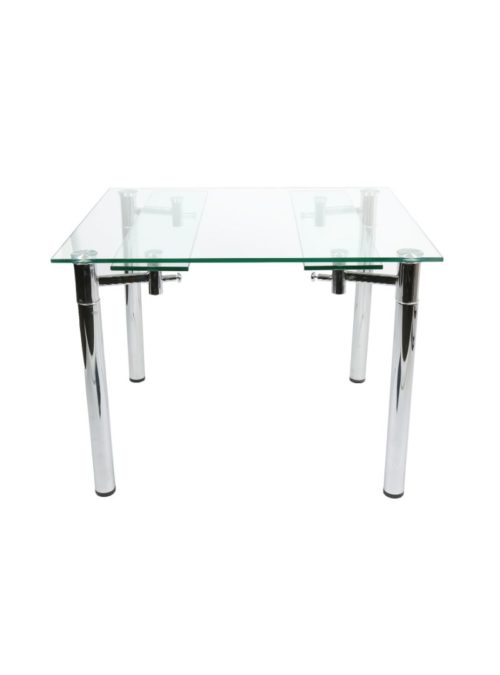 Extendable clear tempered 12 mm glass top with chrome finish legs.
